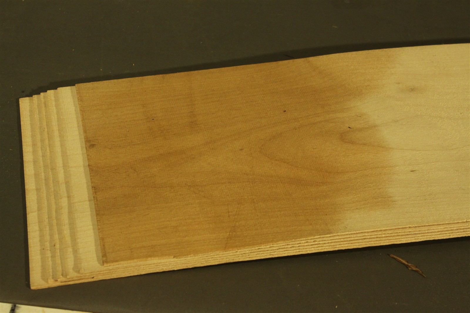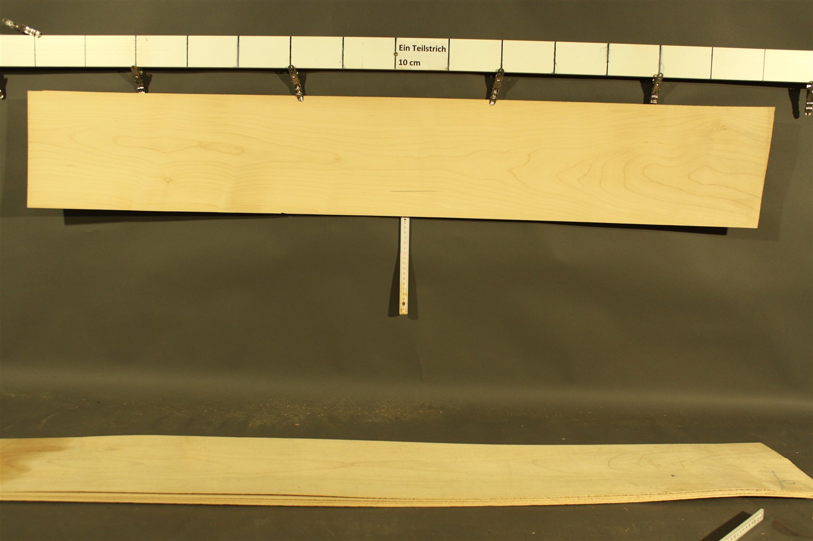 Ahorn-Furnier in 1,5 mm Stärke mit den Maßen 140 x 20 cm und Sägeschnitt.