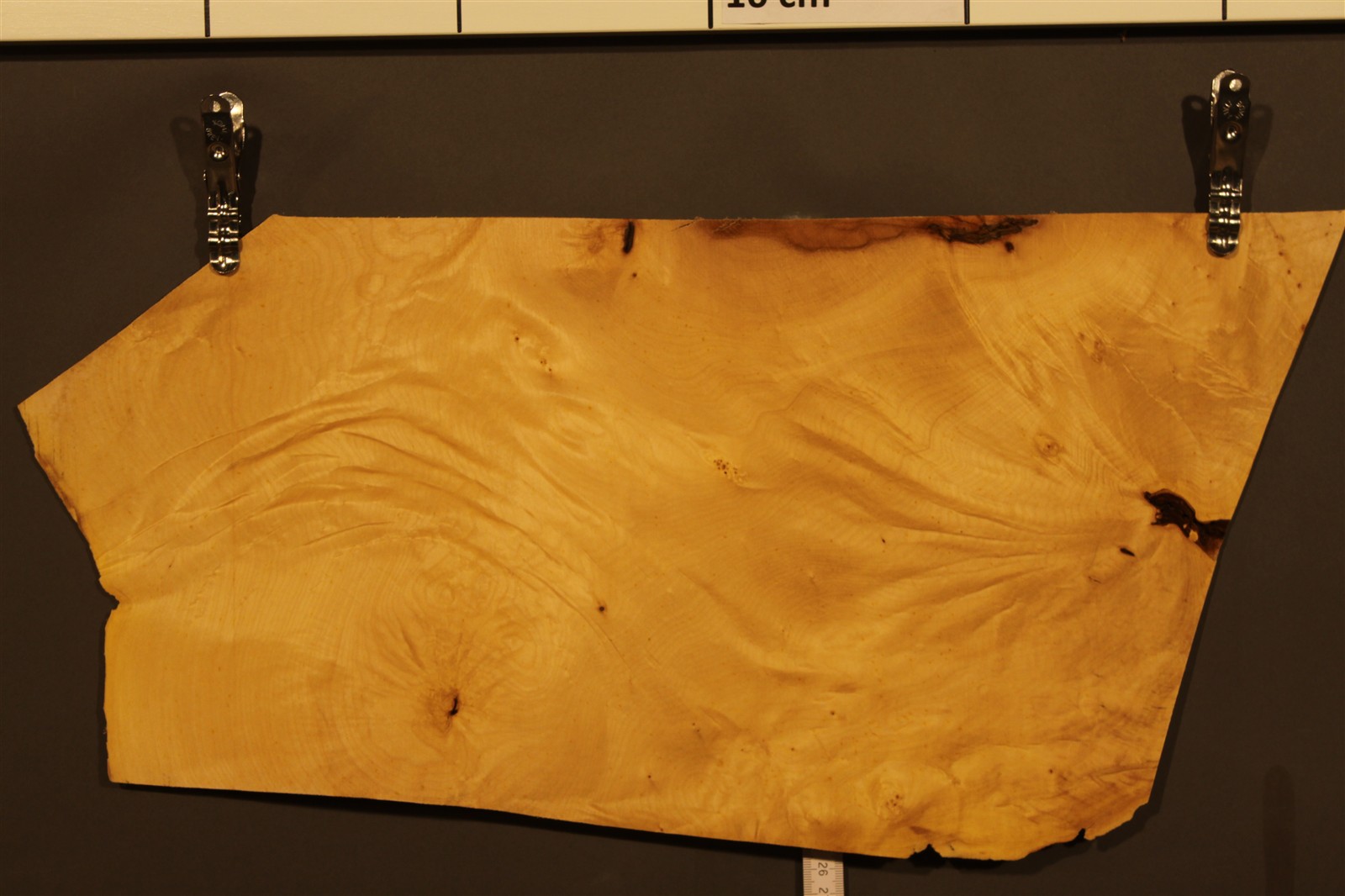 Ahorn-Furnier Maser in 3 mm Stärke mit einer Länge von 40 cm, einer Breite von 23 cm und feinem Sägeschnitt.