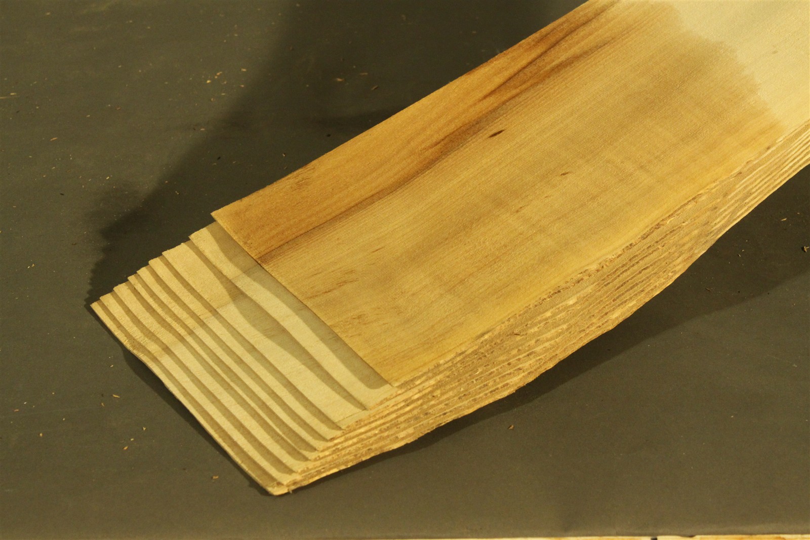 Ahorn-Furnier Riegel in 1,5 mm Stärke mit den Maßen 92 x 12 cm und Sägeschnitt. Der angegebene Preis bezieht sich auf ein einzelnes Blatt des abgebildeten Pakets.