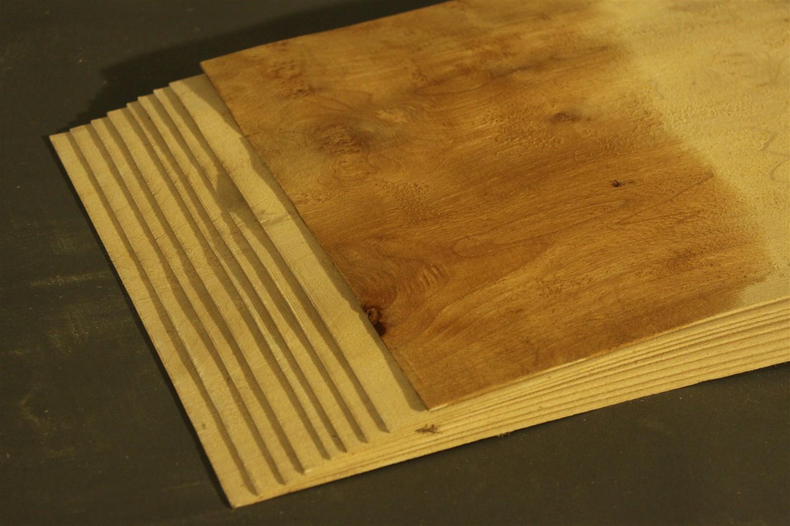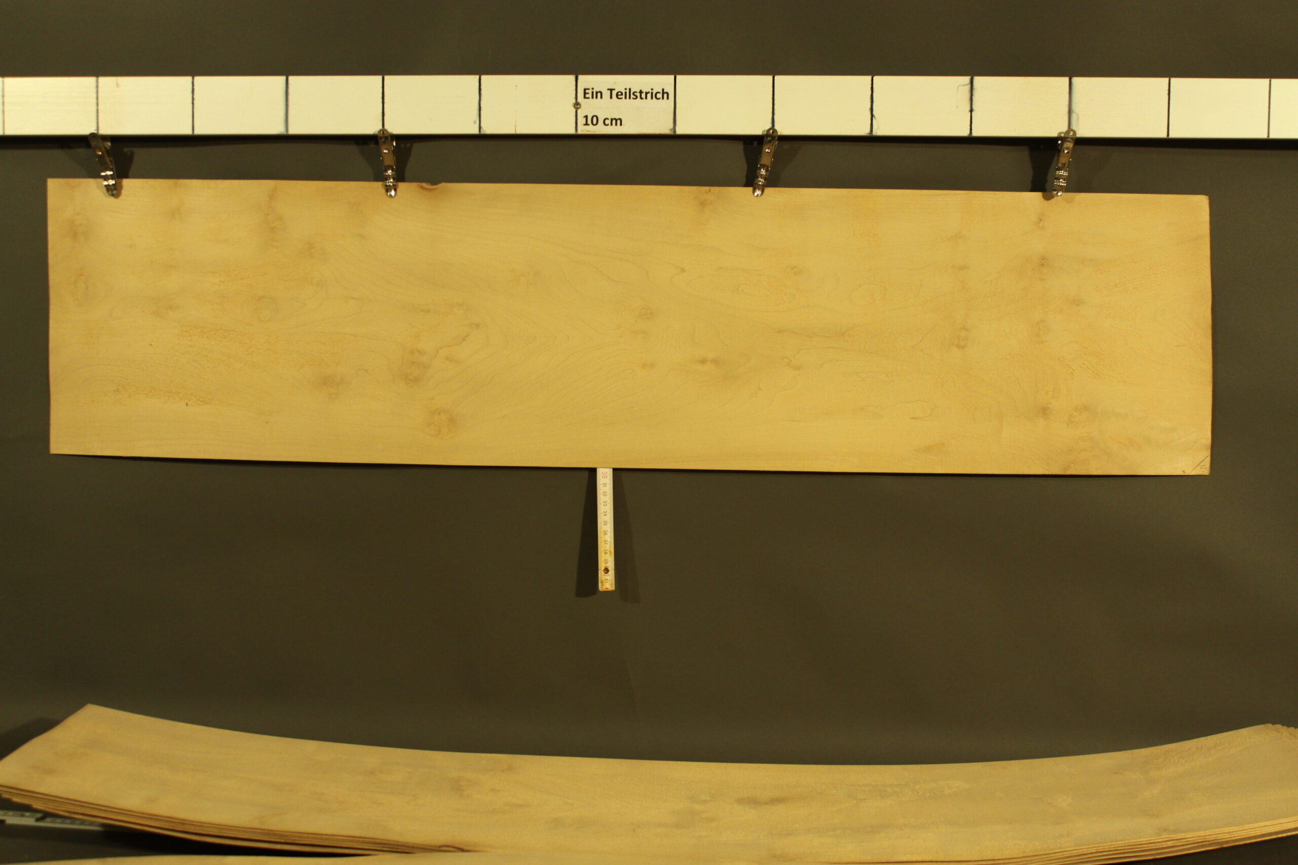 Birke-Furnier in 1,5 mm Stärke mit den Maßen 120 x 29 cm und Sägeschnitt. Der angegebene Preis bezieht sich auf ein einzelnes Blatt des abgebildeten Pakets.