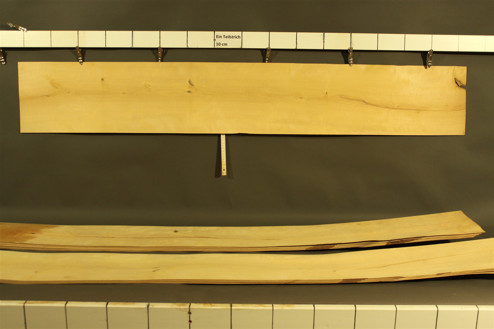 Birke-Furnier in 1,5 mm Stärke mit den Maßen 165 x 26 cm und Sägeschnitt. Der angegebene Preis bezieht sich auf ein einzelnes Blatt des abgebildeten Pakets.