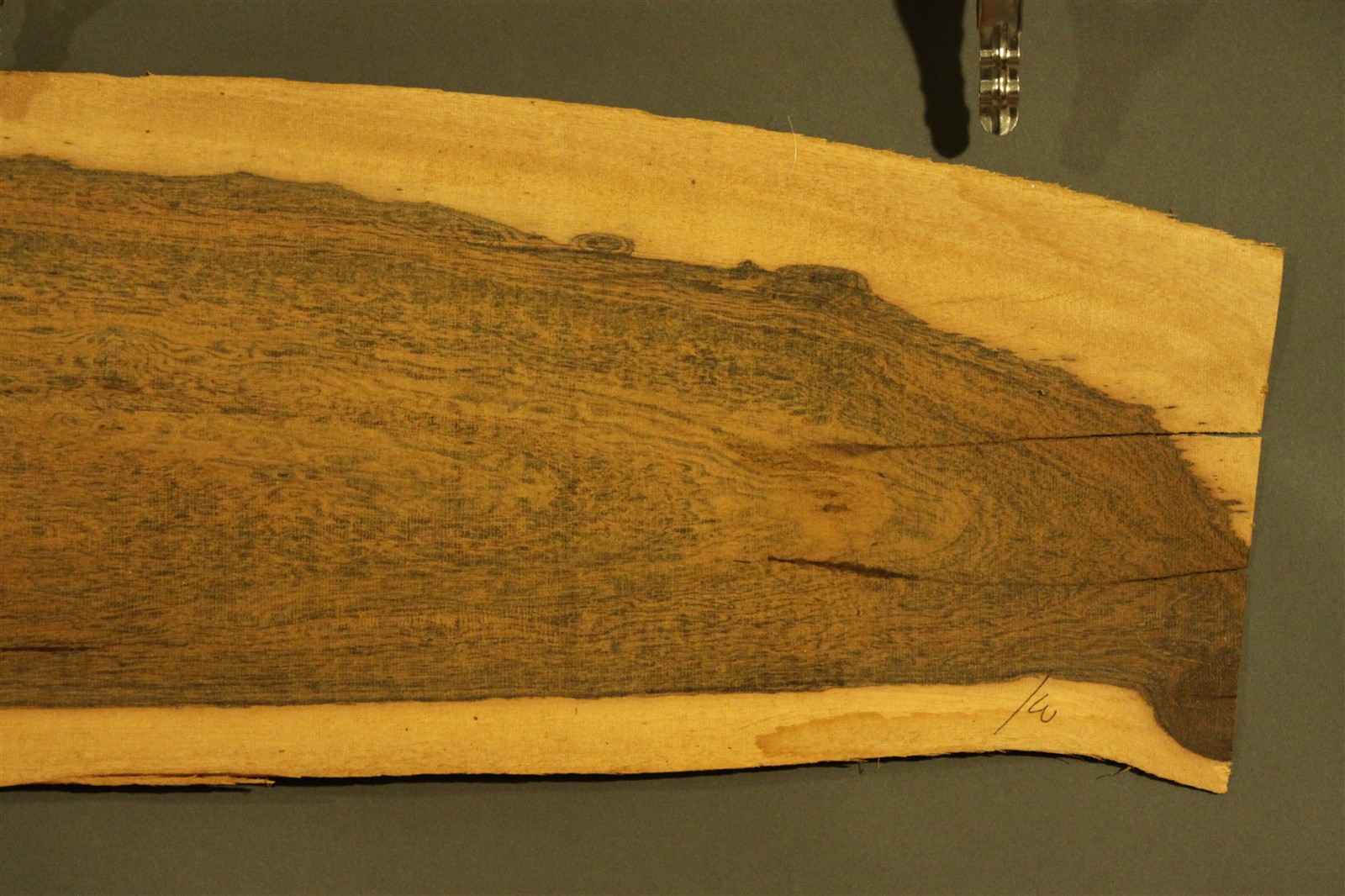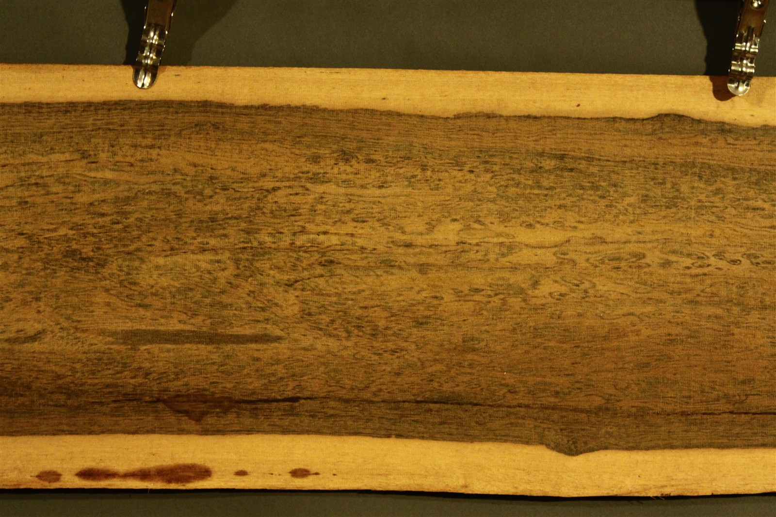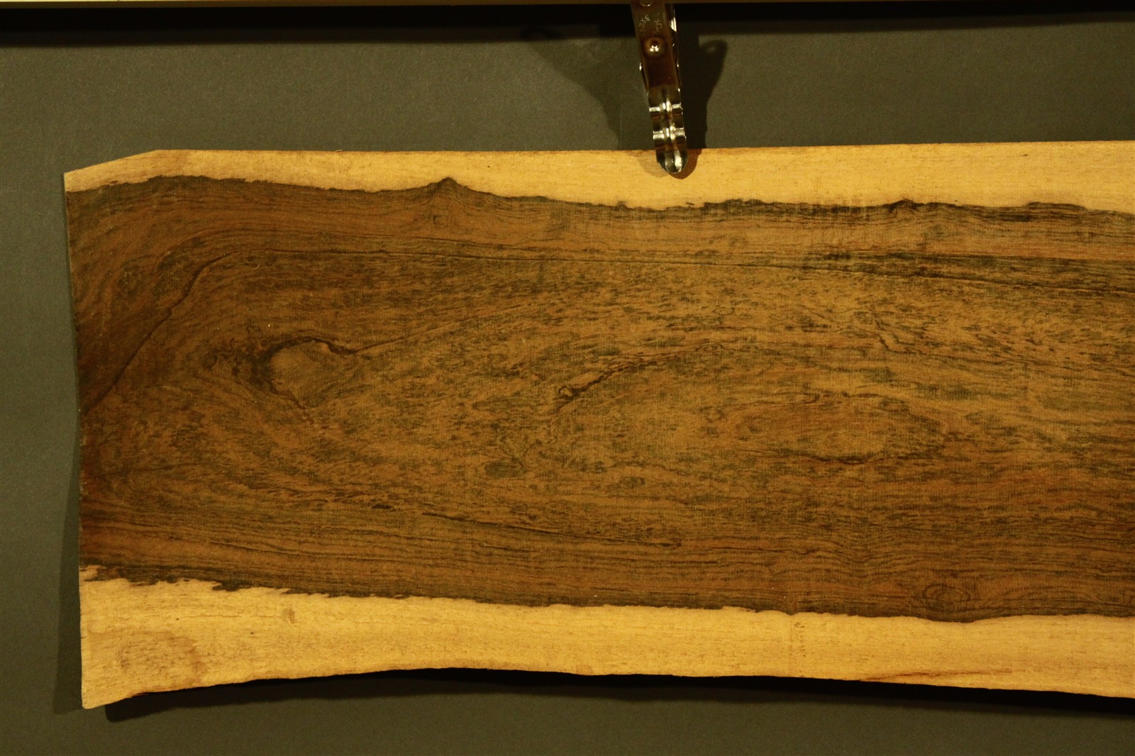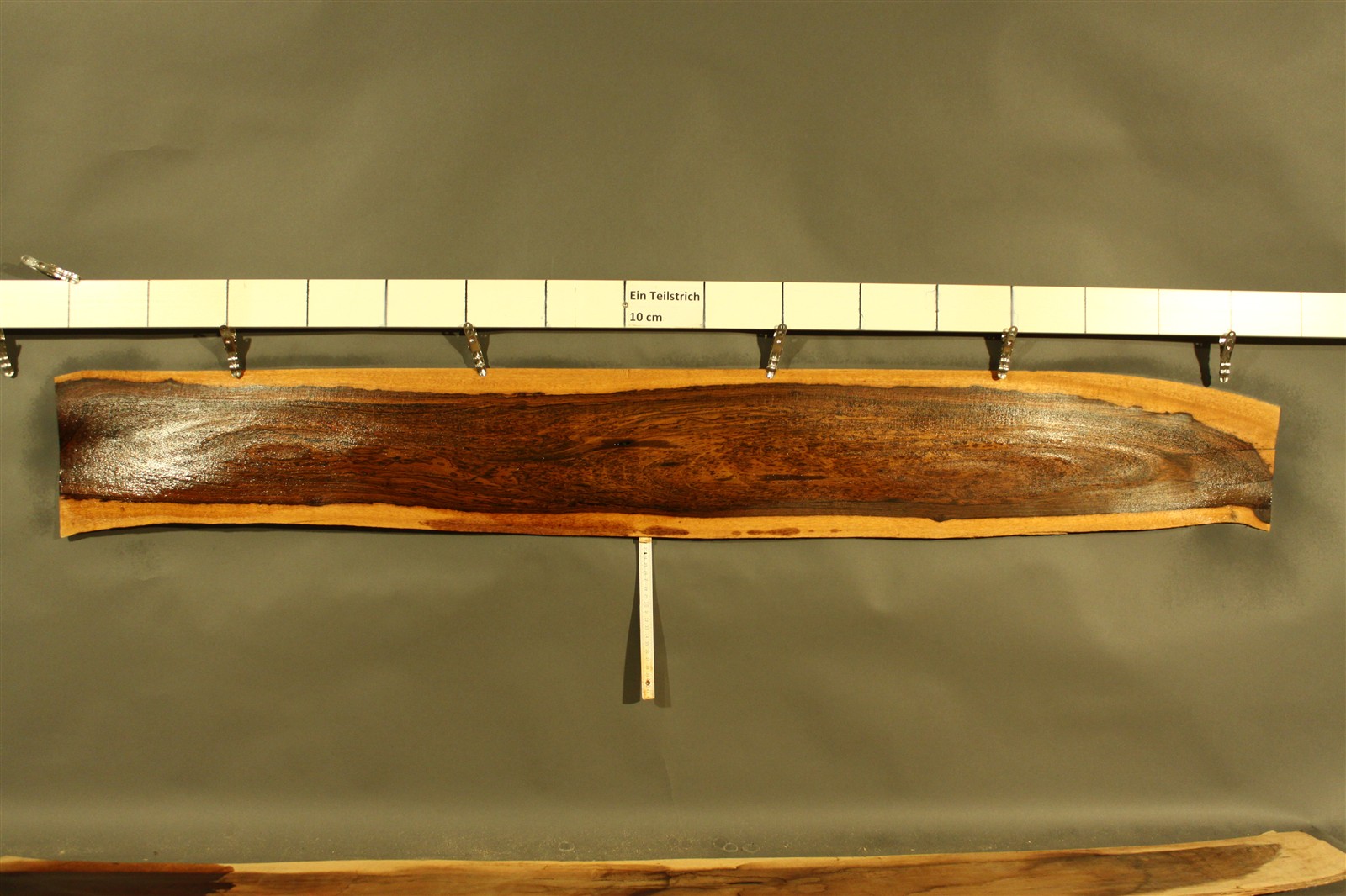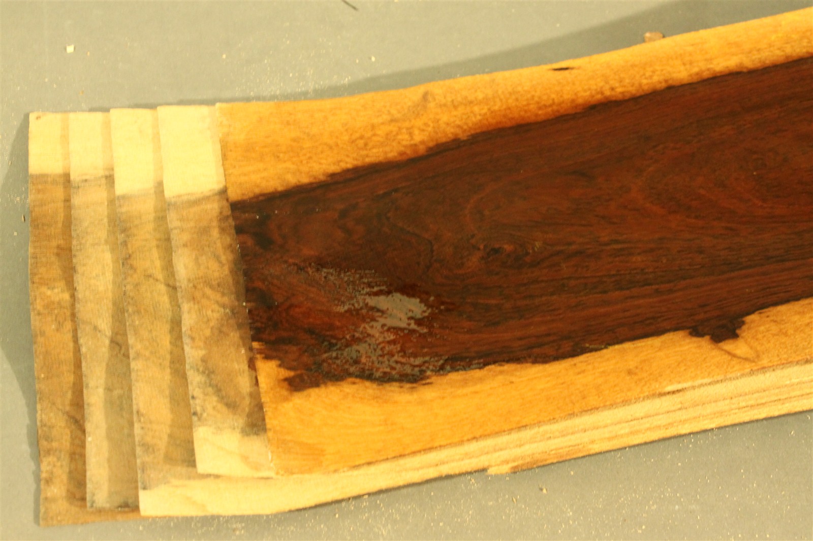 Bocote-Furnier in 1,5 mm Stärke mit einer Länge von 160 cm, einer Breite von 19 cm und Sägeschnitt.