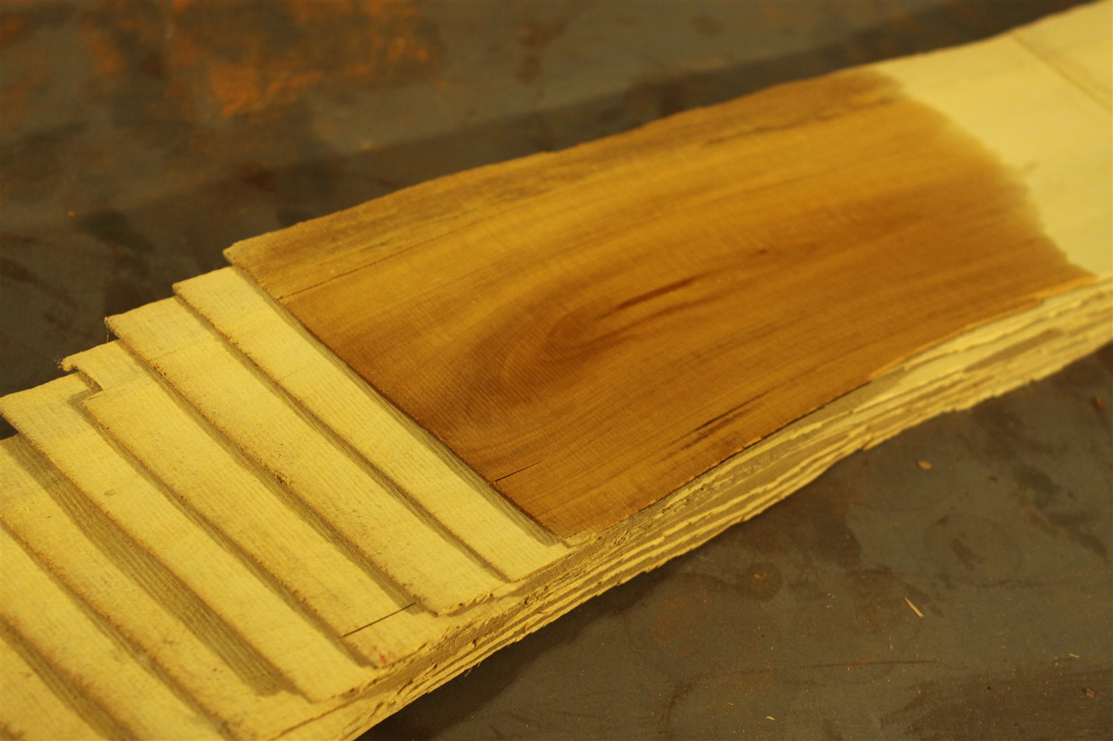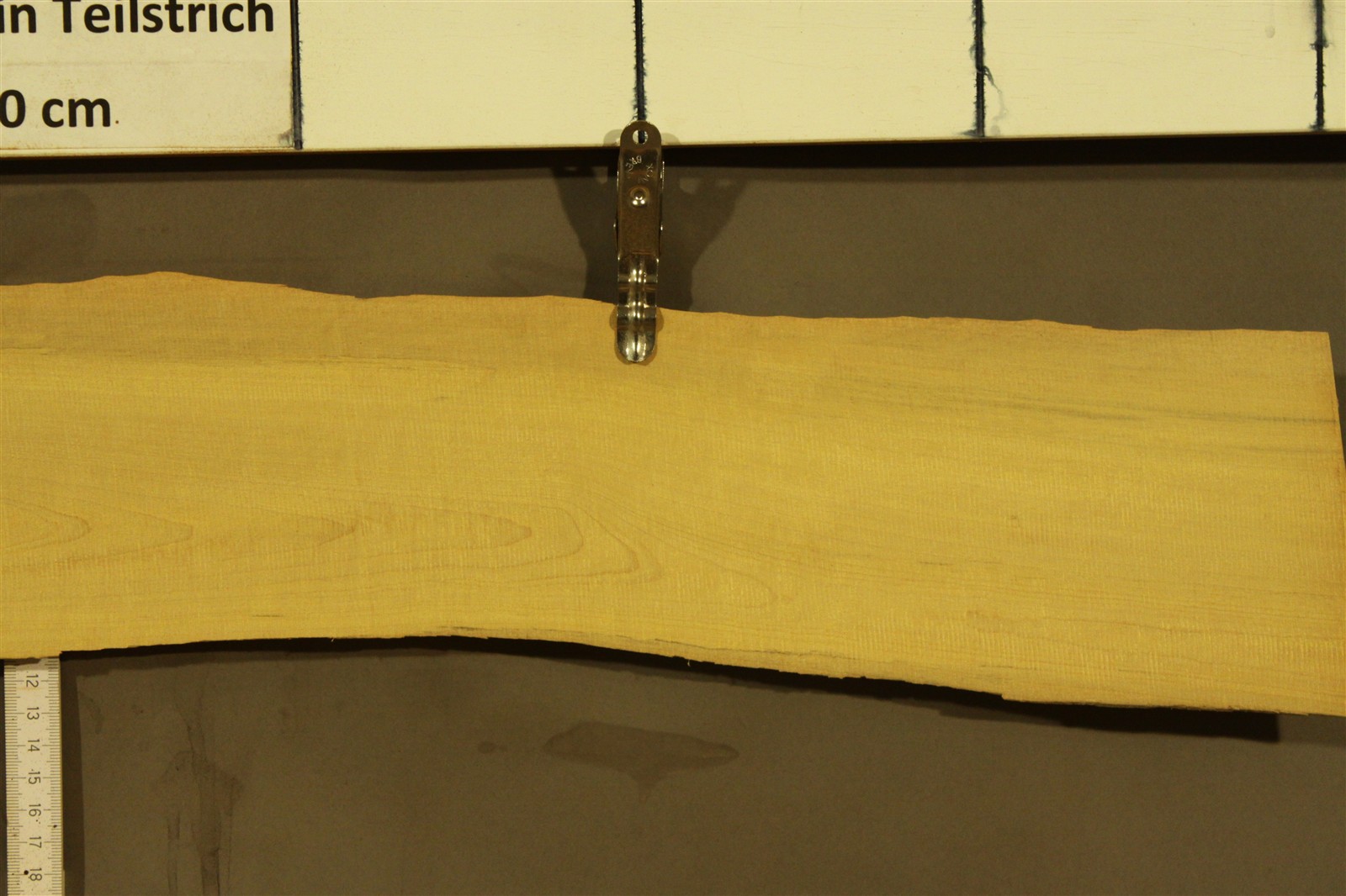 Buchsbaum-Furnier in 1,2 mm Stärke mit einer Länge von 65 cm und einer Breite von 8 cm. Das Sägefurnier weist einen groben Sägeschnitt auf.