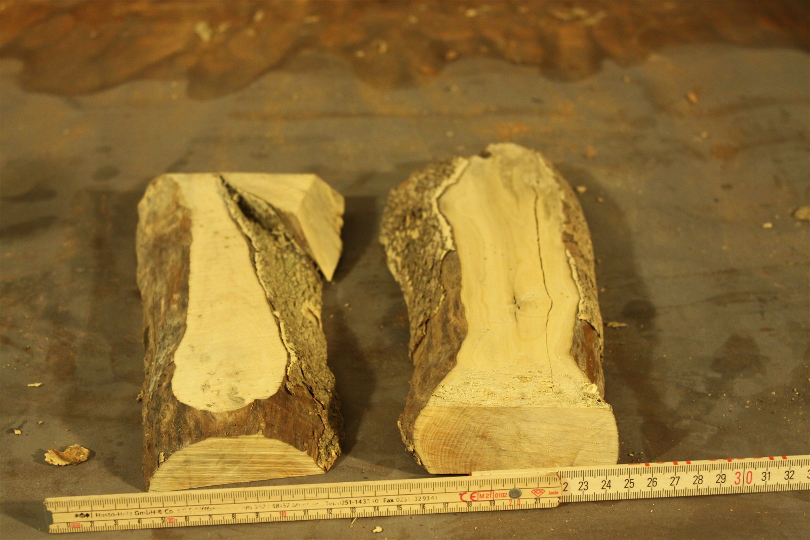 Buchsbaum massiv in der Länge ca. 25 cm und mit einem Stammdurchmesser von ca. 9 cm. Der massive Stamm wurde längs in die zwei abgebildeten Teile aufgetrennt, die hier zusammen im Set angeboten werden.