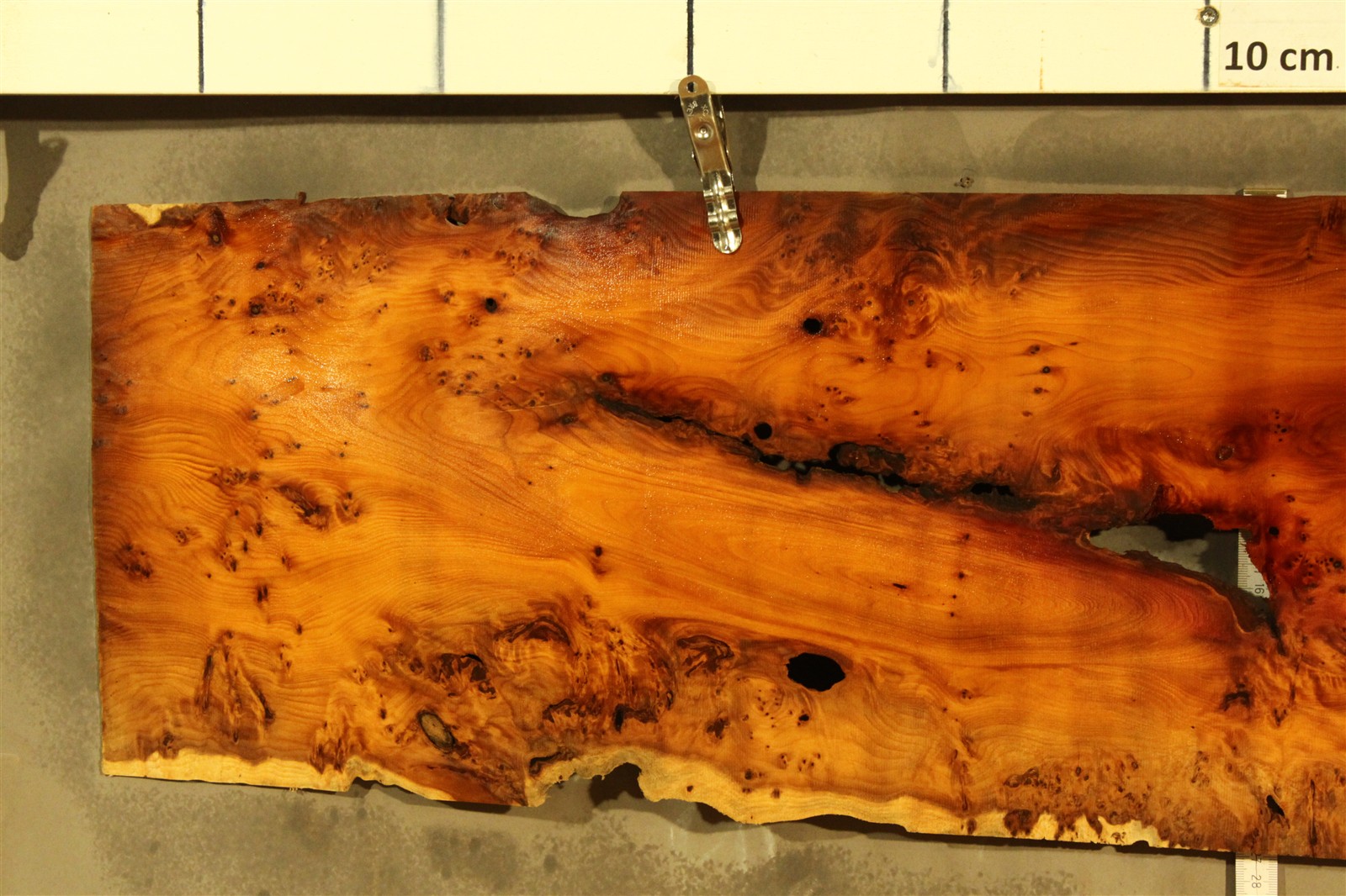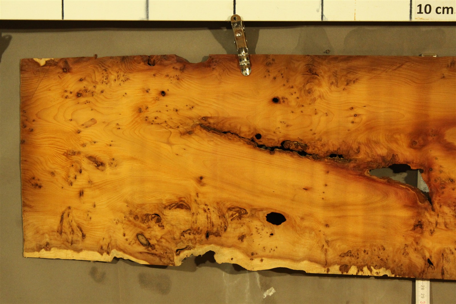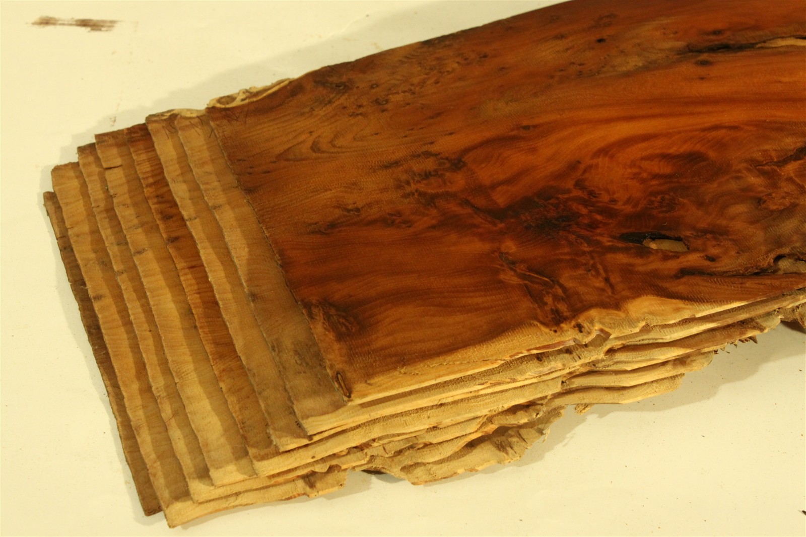 Eibe-Furnier in 100 cm Länge, 25 cm Breite und mit einer Stärke von 1,8 mm. Das Furnier weist einen feinen Sägeschnitt auf.