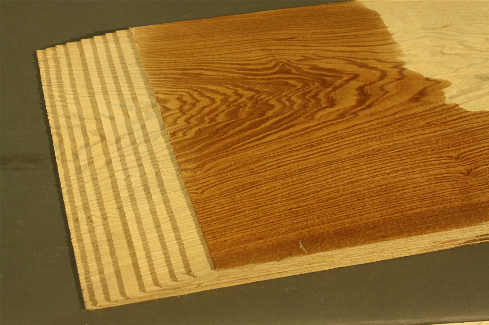 Esche-Furnier in 1,5 mm-Stärke mit einer Länge von 80 cm, einer Breite von 32 cm und Sägeschnitt.
