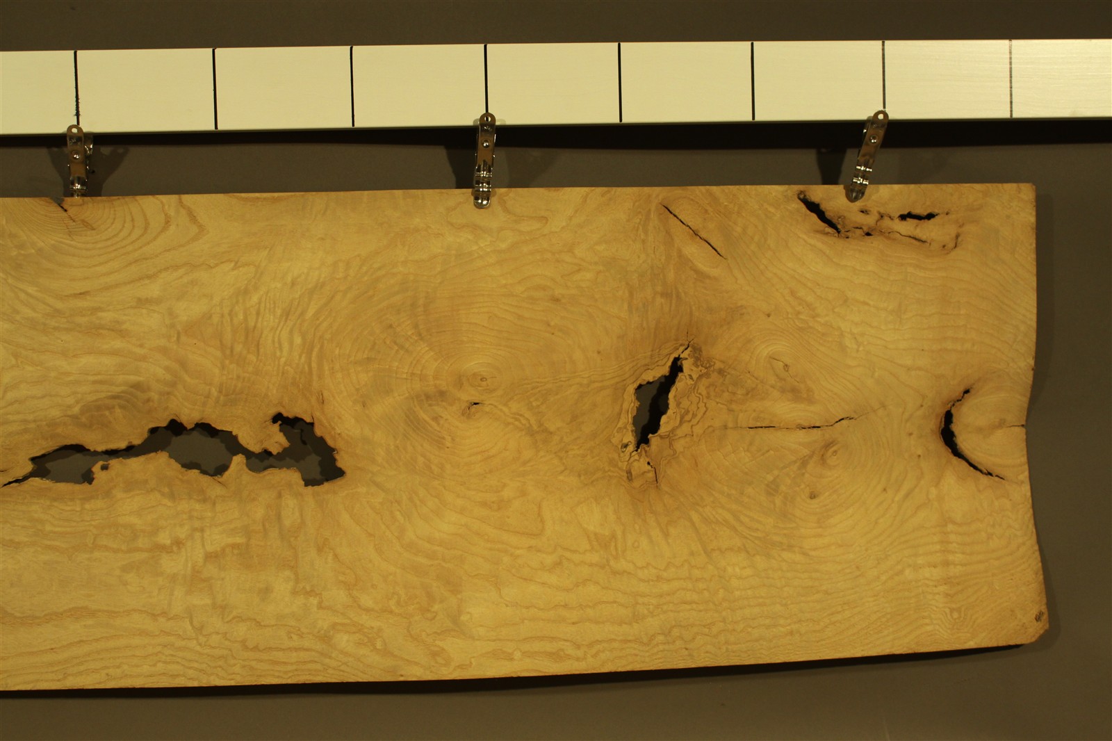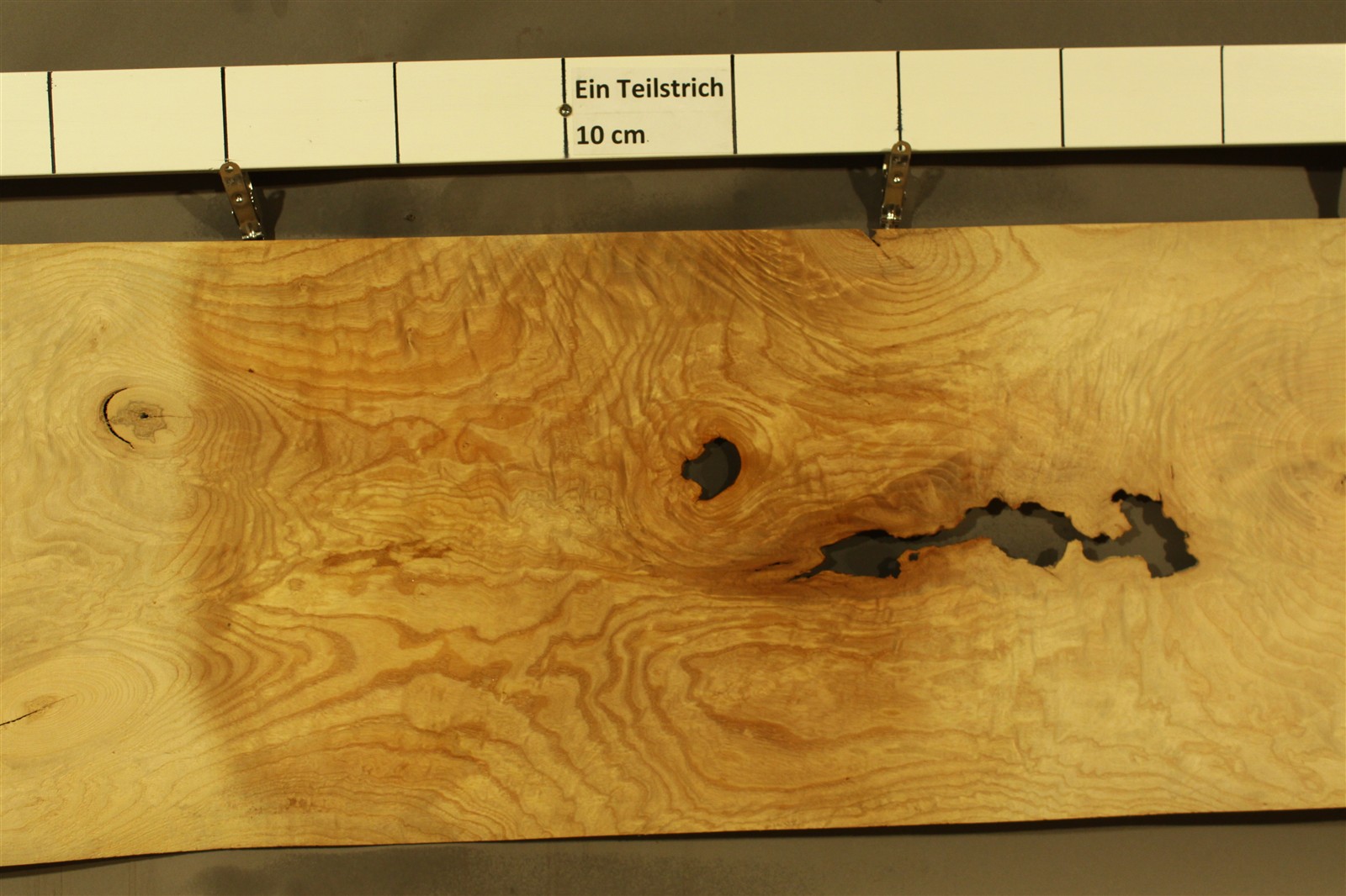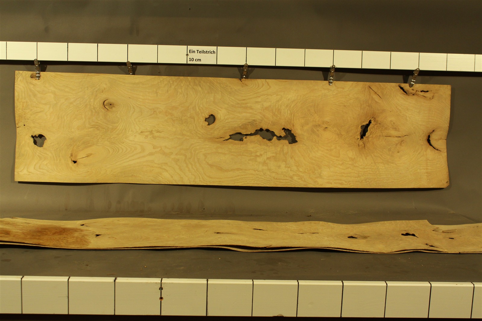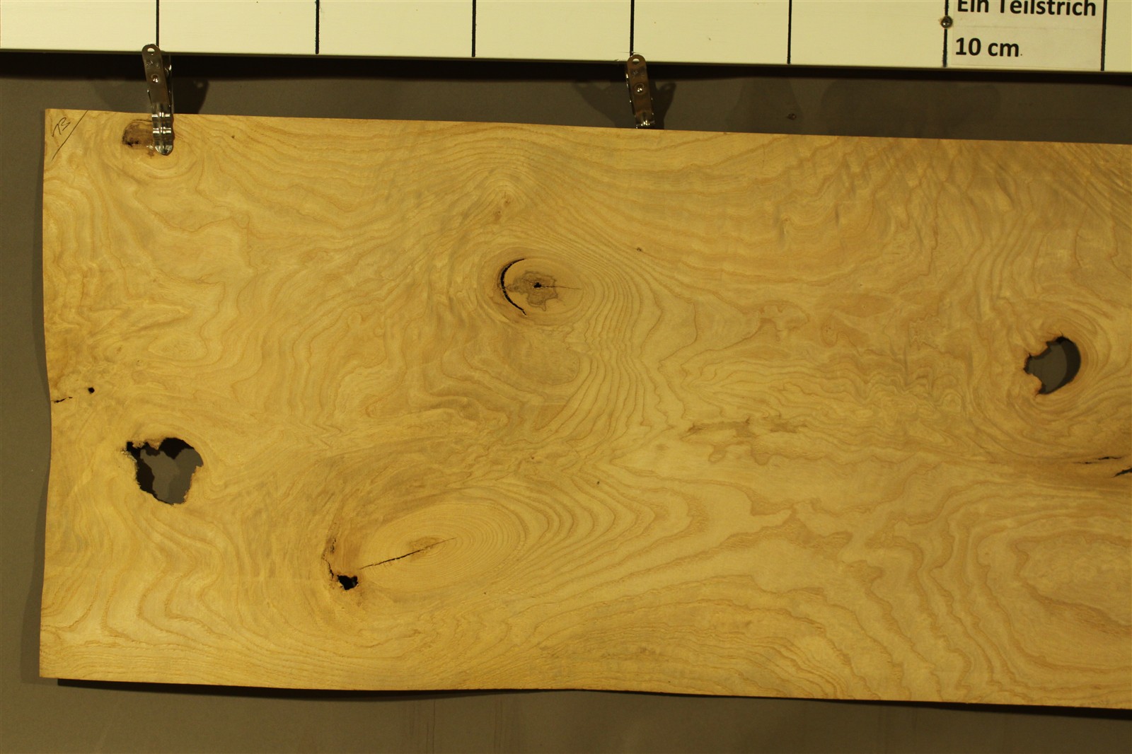 Esche-Furnier in 1,8 mm-Stärke mit einer Länge von 130 cm, einer Breite von 37 cm und Sägeschnitt. Es handelt sich um Blumenesche / Ungarische Esche.