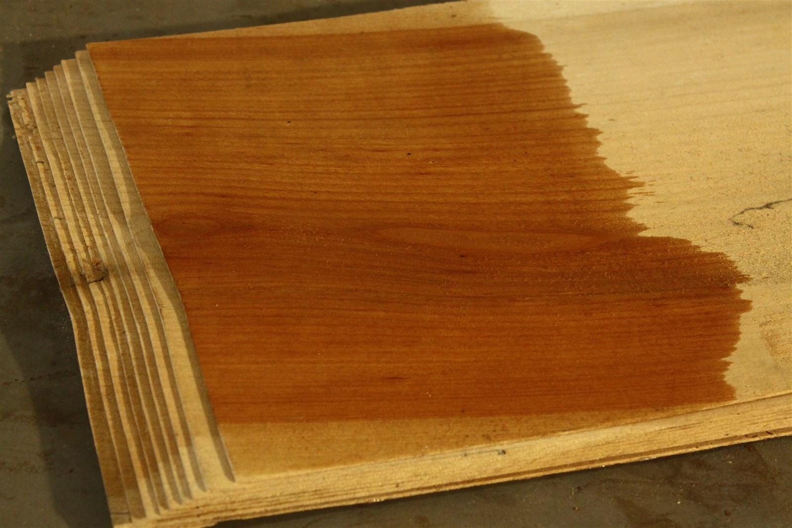Kirschbaum-Furnier in 1,6 mm Stärke mit einer Länge von 85 cm, einer Breite von 30 cm und Sägeschnitt.