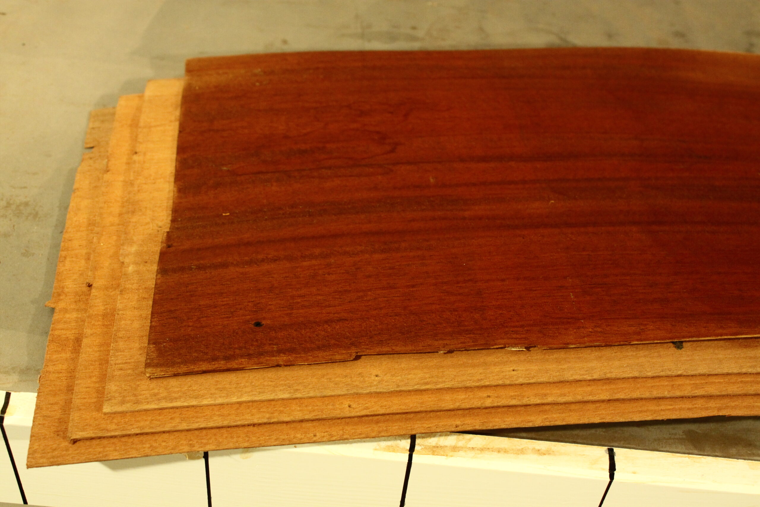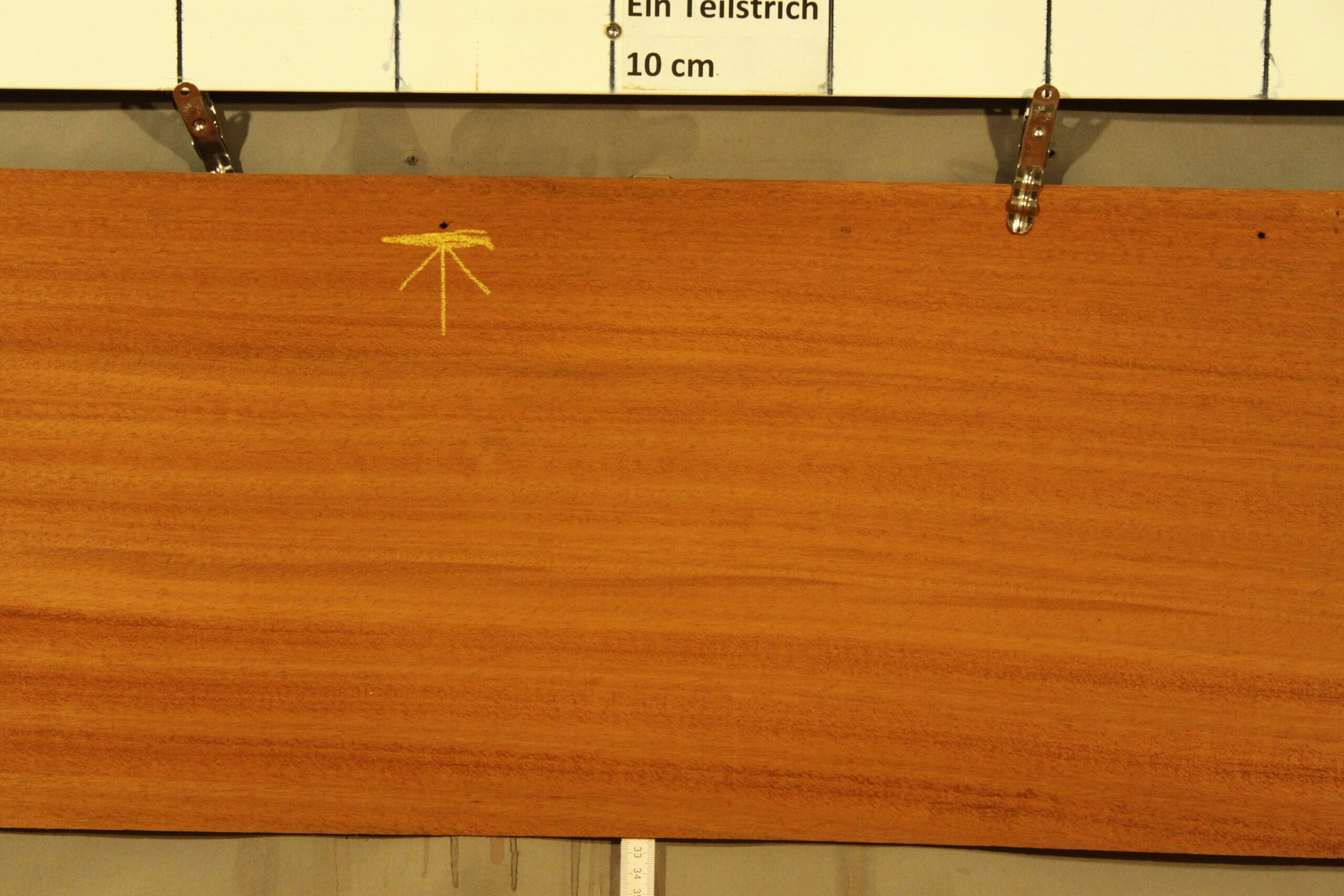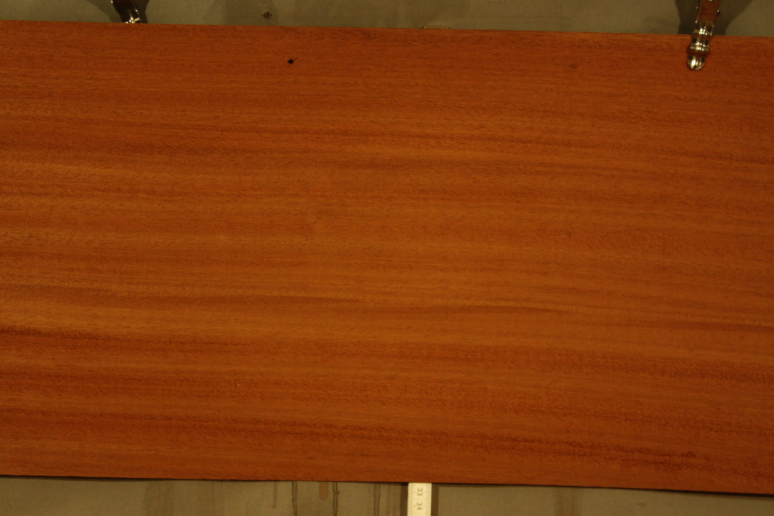 Mahagoni-Furnier Kuba in 190 cm Länge mit einer Breite von 29 cm. Das Furnier weist eine Stärke von 1,5 mm auf, die Breite wurde bis zu den Löchern gemessen.