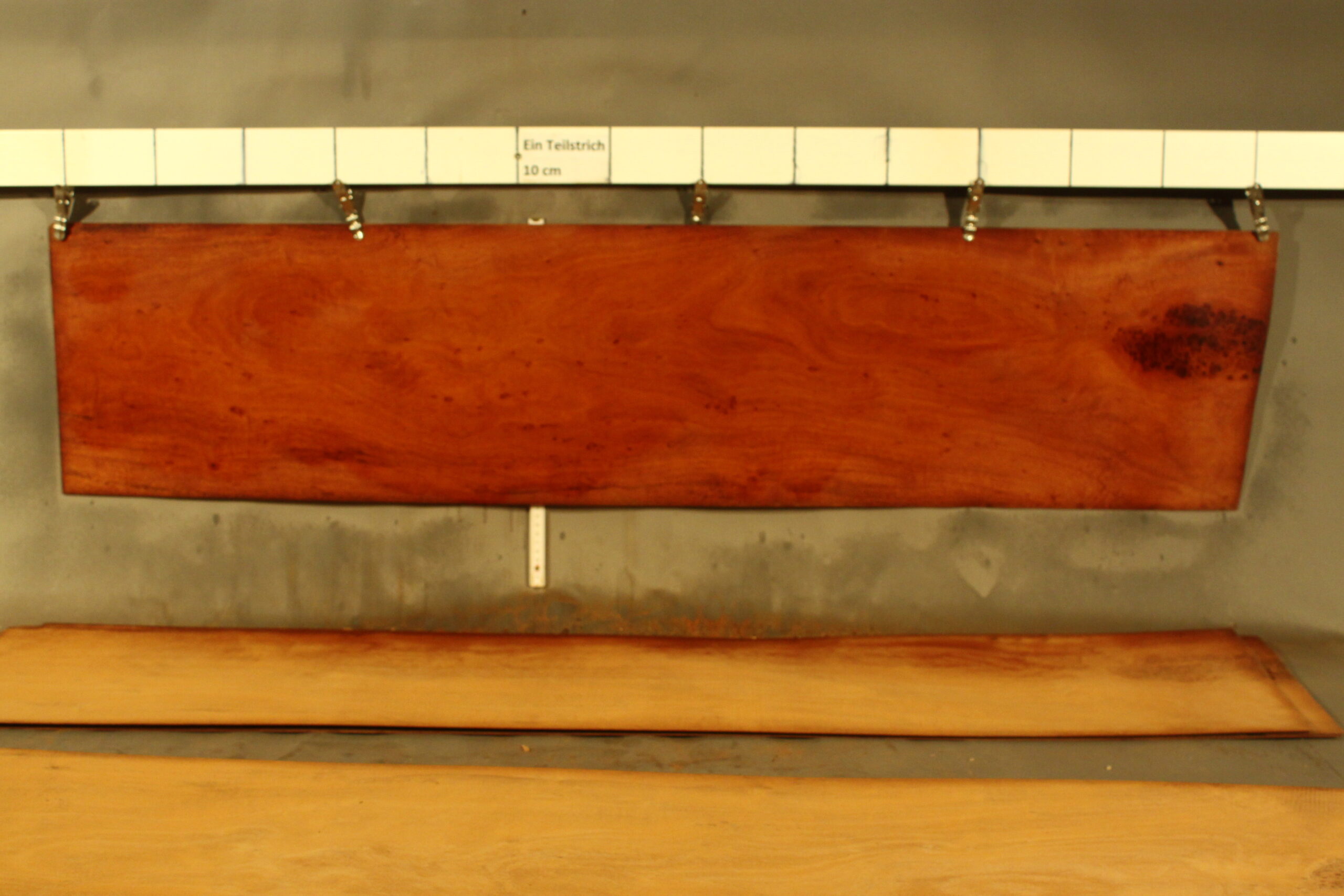 Mahagoni-Furnier Kuba in 135 cm Länge mit einer Breite von 31 cm. Das Furnier weist eine Stärke von 1,8 mm auf.
