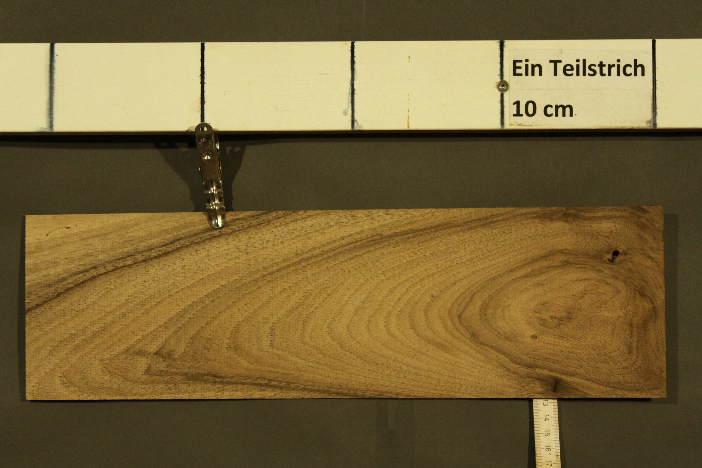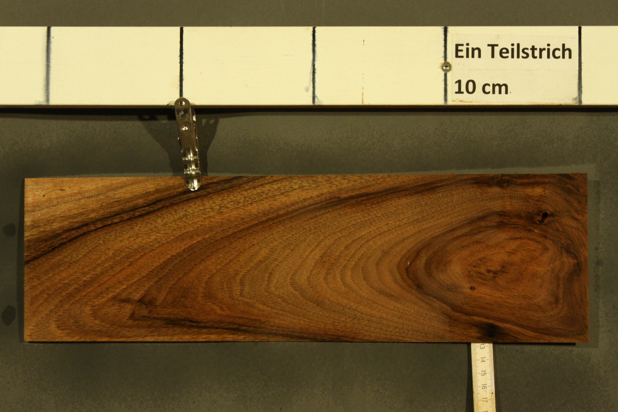 Nussbaum-Furnier in 1,2 mm Stärke mit einer Länge von 42 cm, einer Breite von 12 cm und feinem Sägeschnitt.