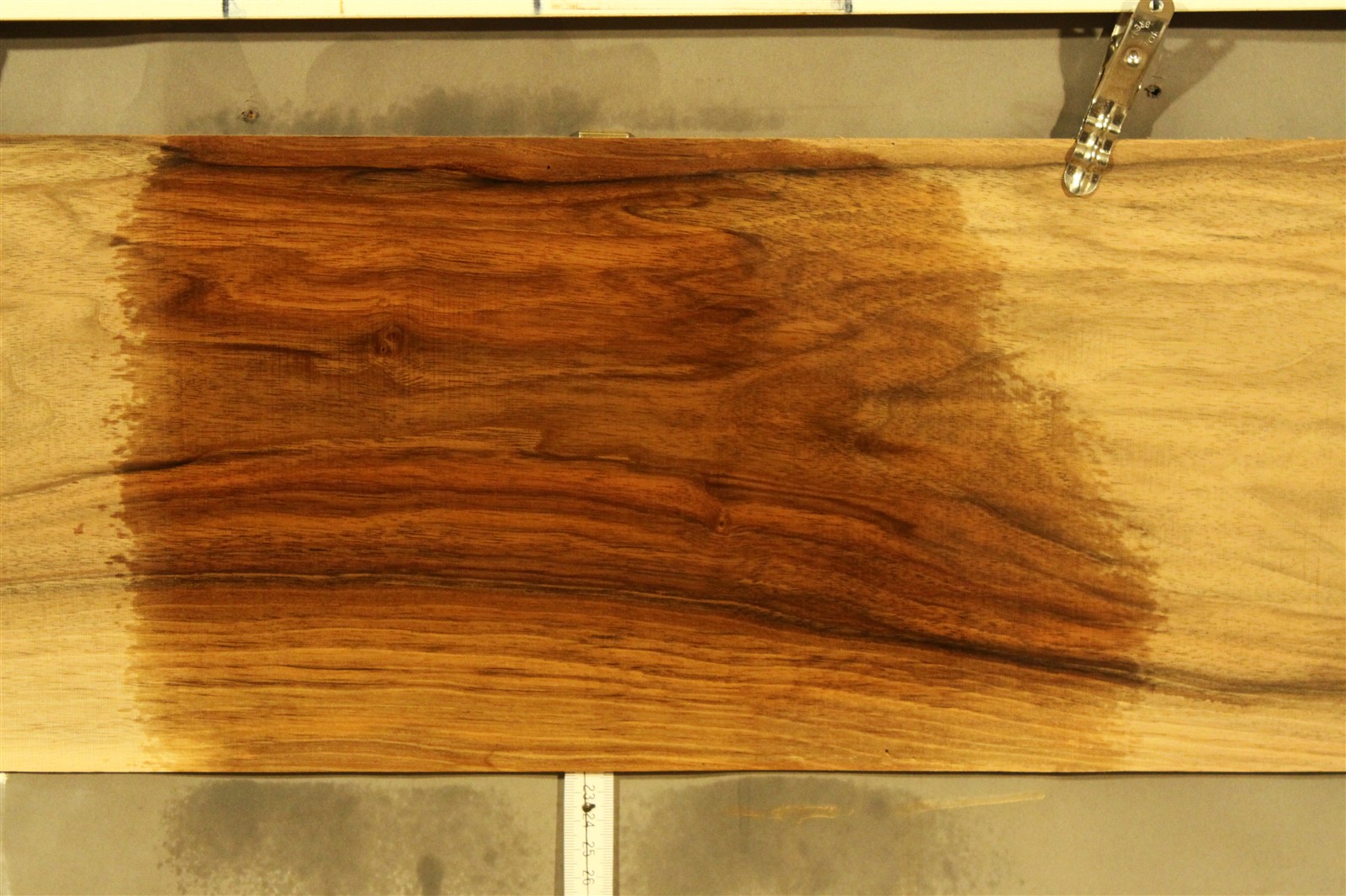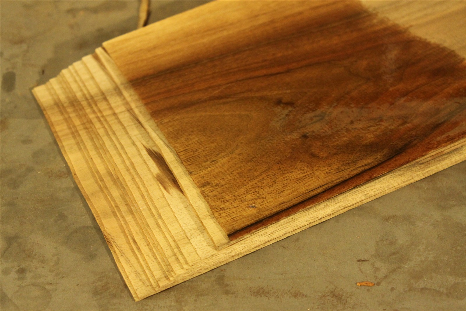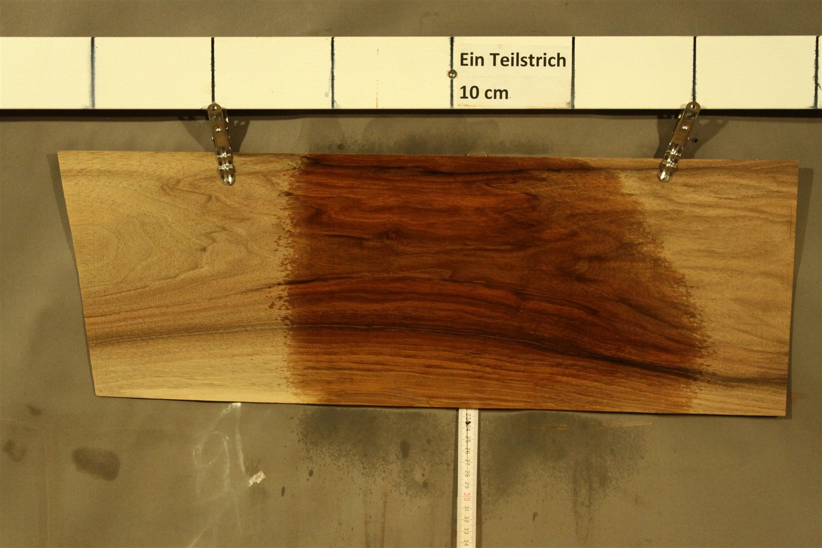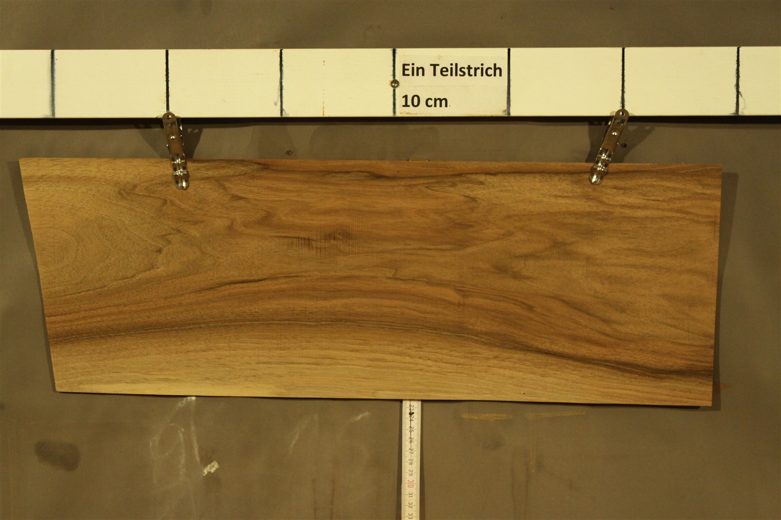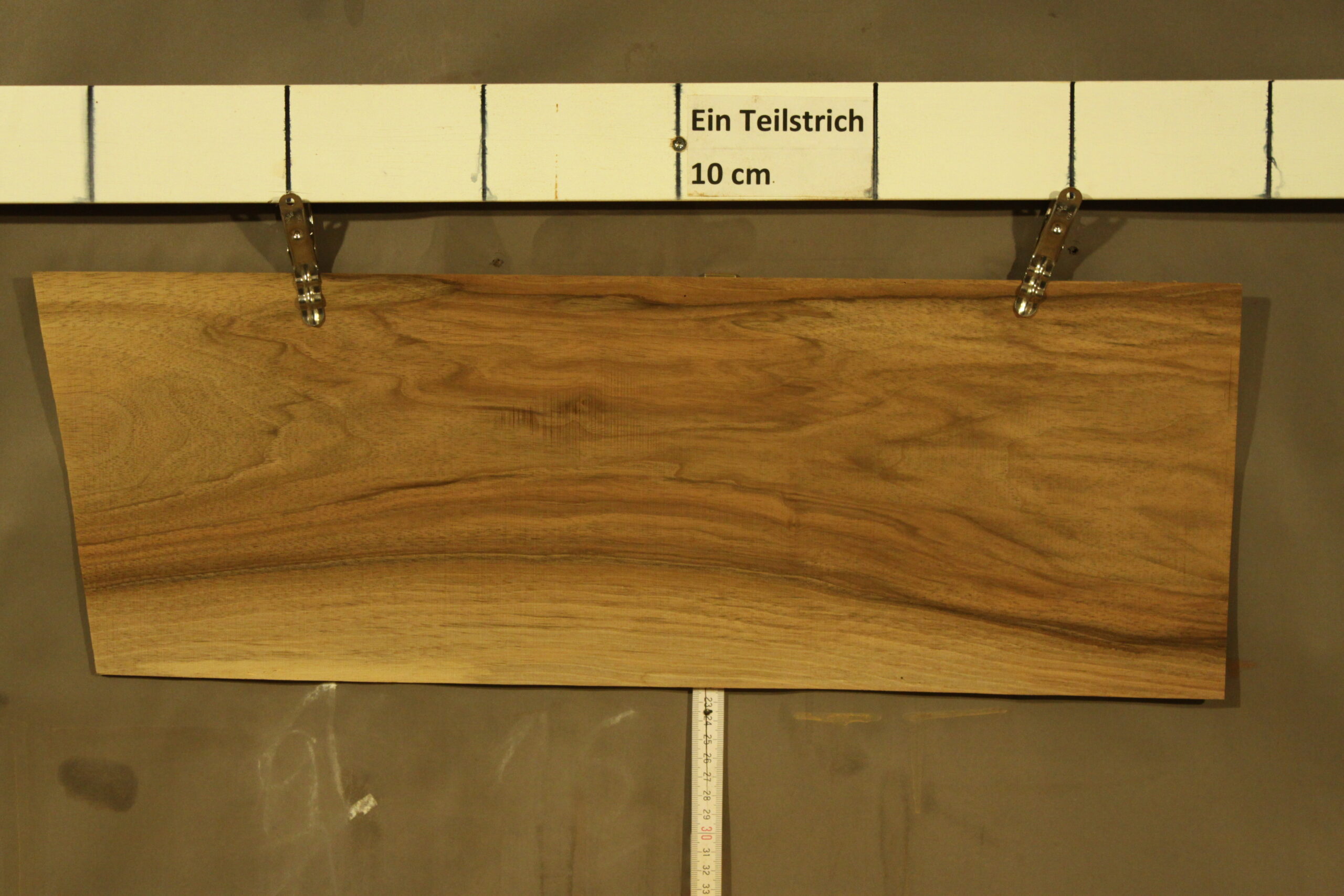Nussbaum-Furnier in 1,2 mm Stärke mit einer Länge von 60 cm, einer Breite von 21 cm und feinem Sägeschnitt.