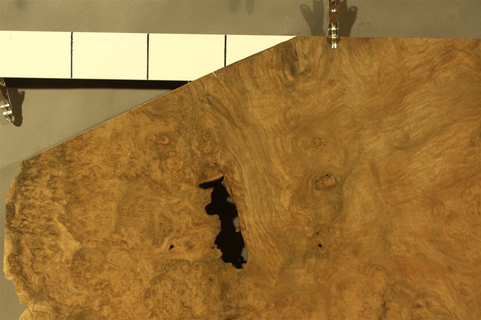Nussbaum-Furnier in 1,5 – 2 mm Stärke mit einer Länge von 100 cm, einer Breite von 40 cm und Sägeschnitt.