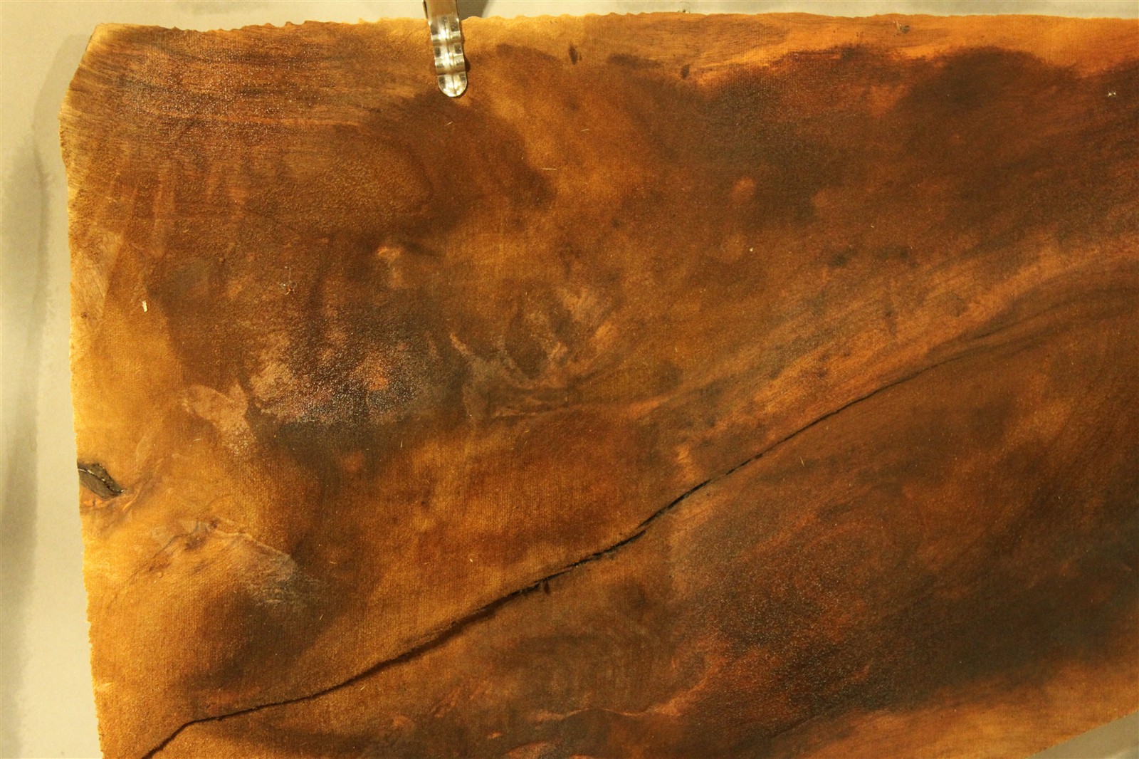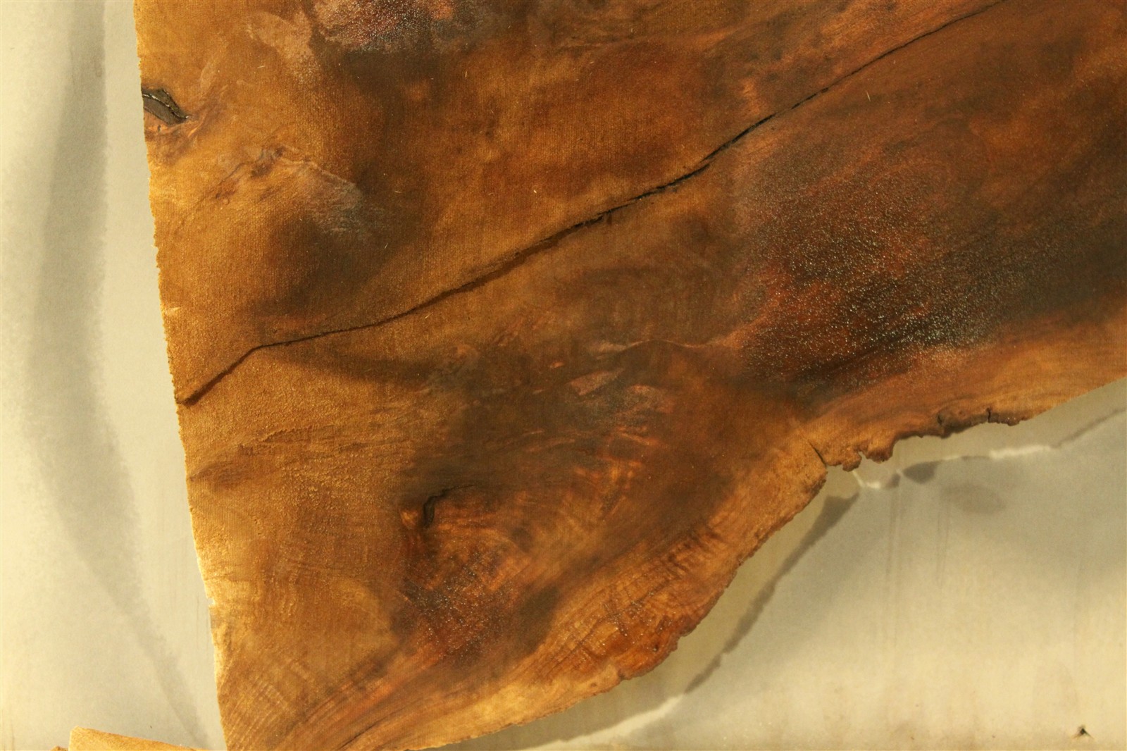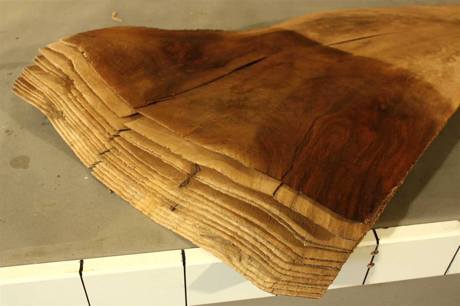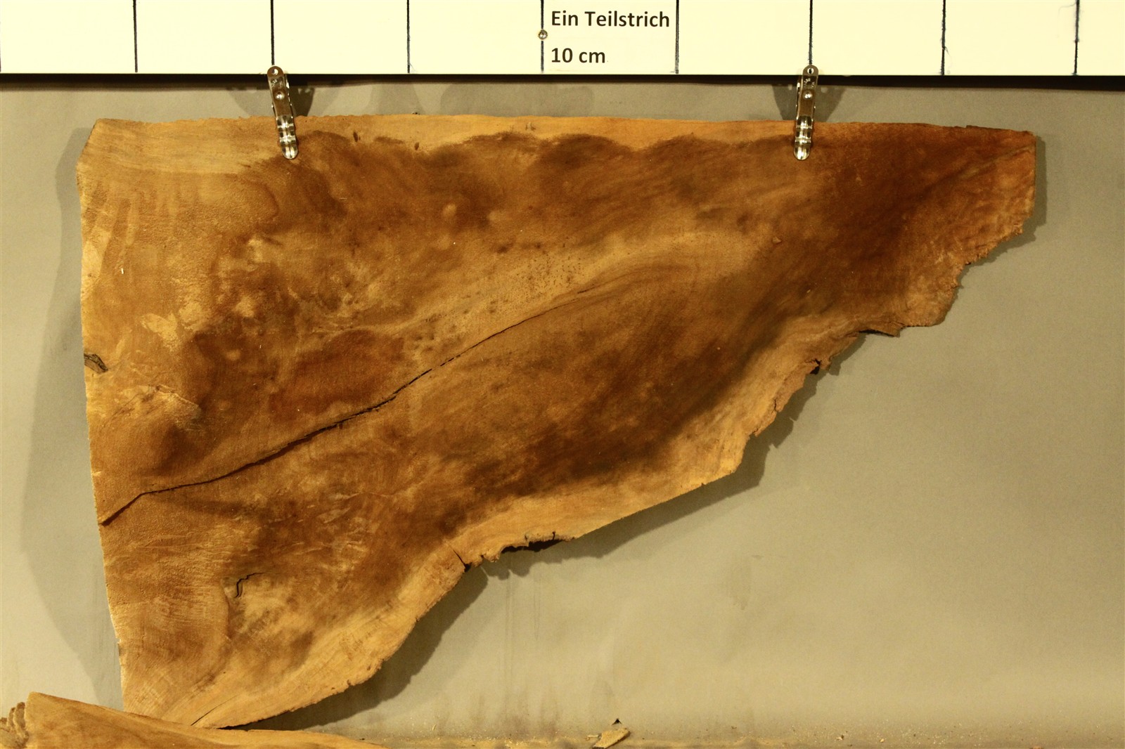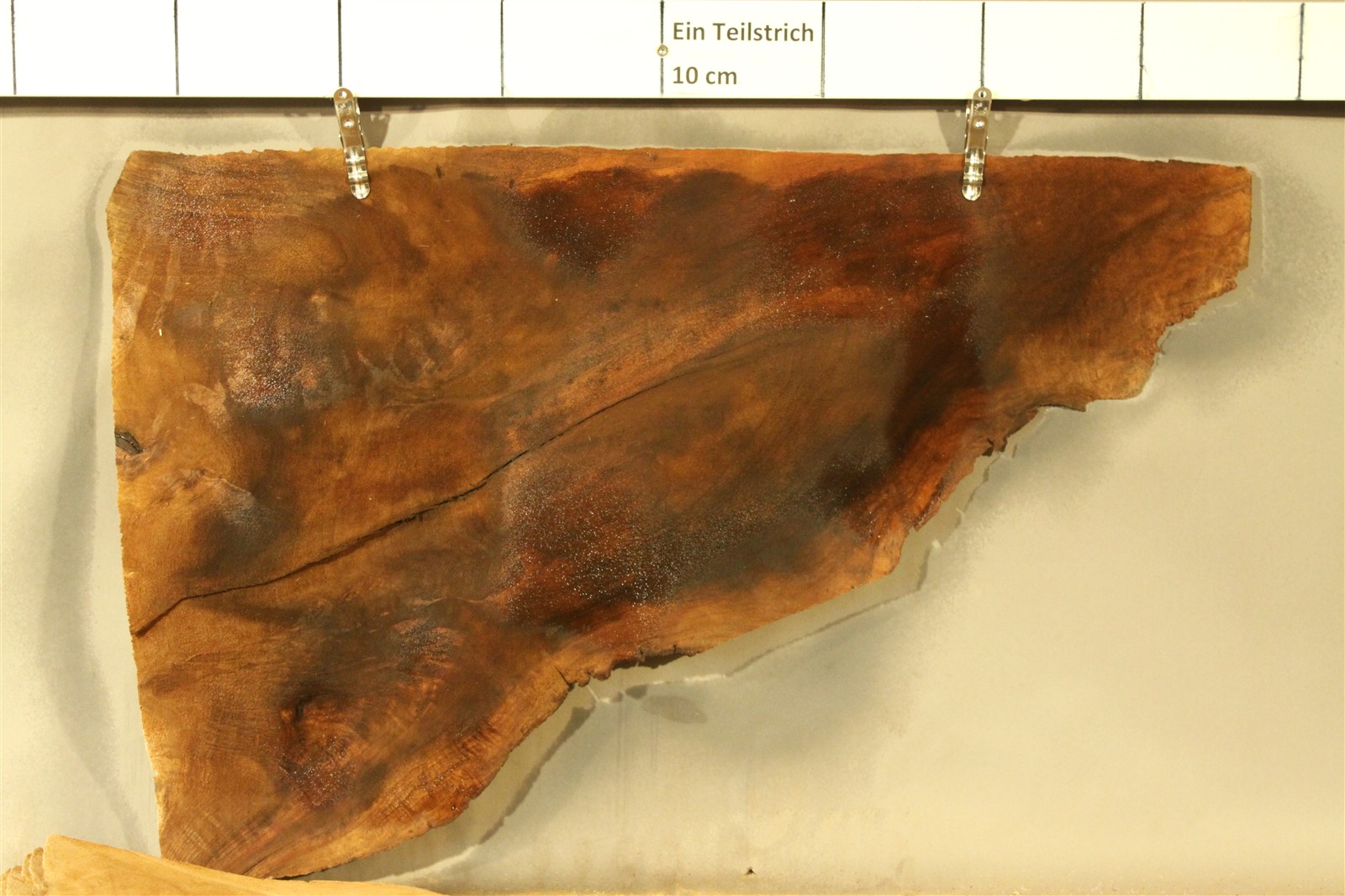 Nussbaum-Furnier in 1,5 mm Stärke mit einer Länge von 60 cm, einer Breite von 23 cm und Sägeschnitt.