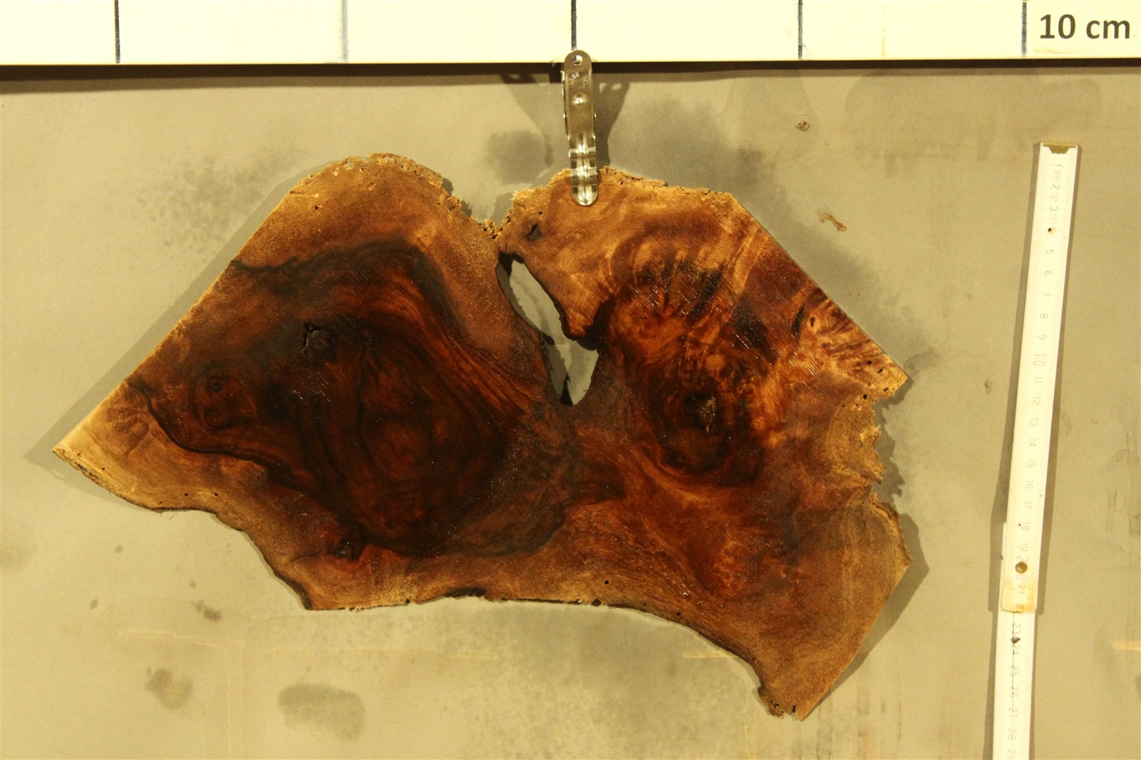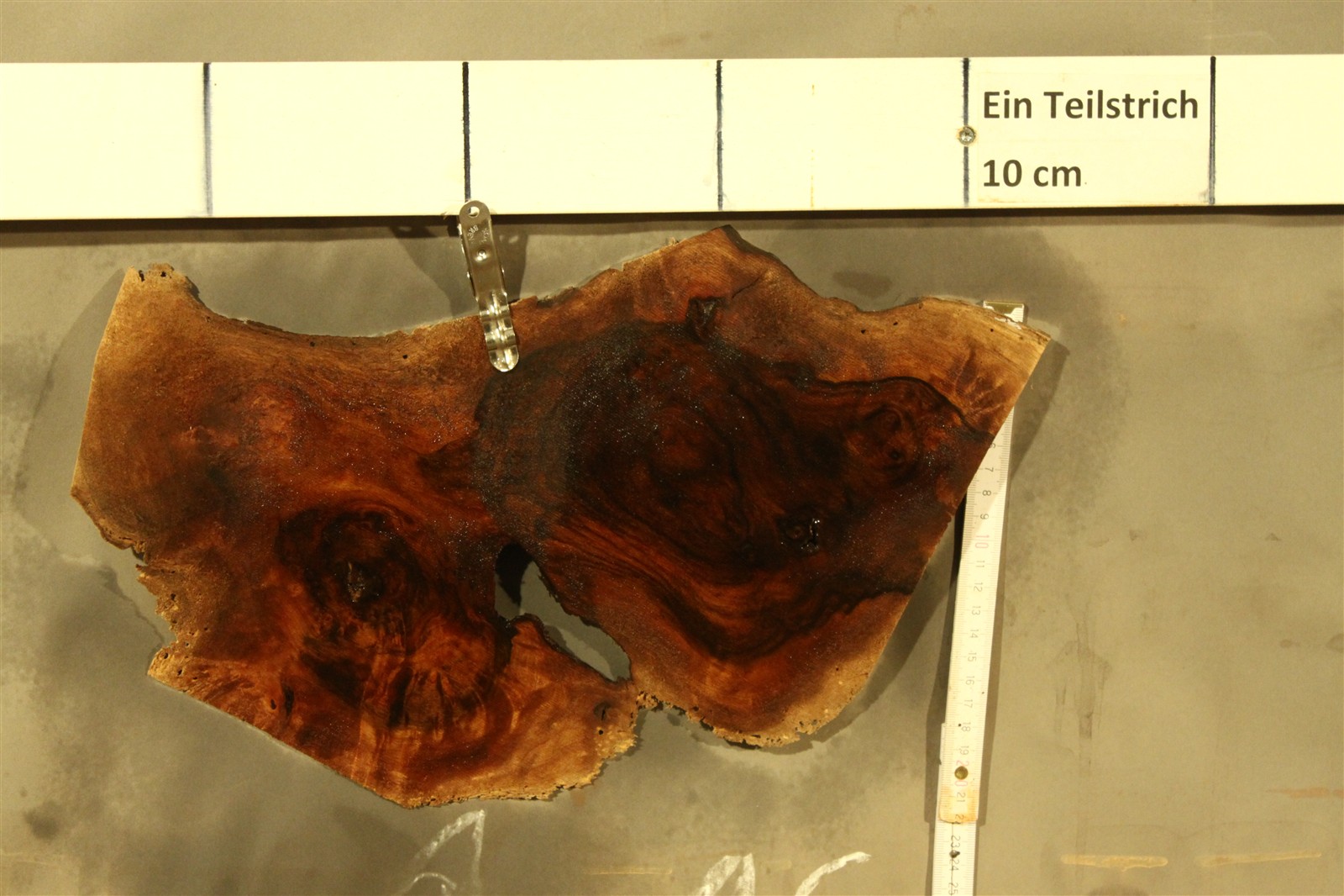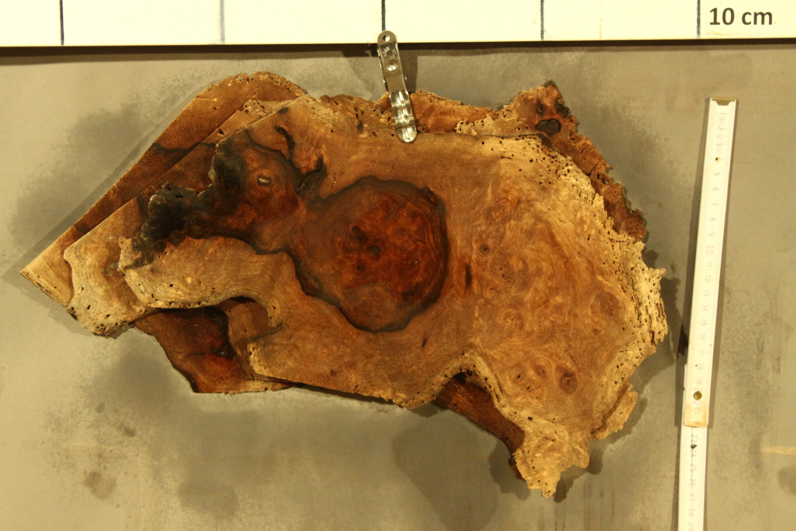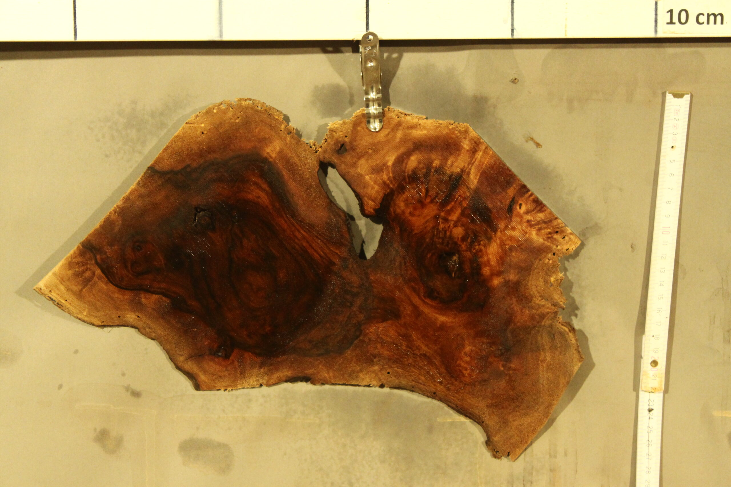 Nussbaum-Furnier in 1,8 mm Stärke mit einem Durchmesser von ca. 20 cm und feinem Sägeschnitt.