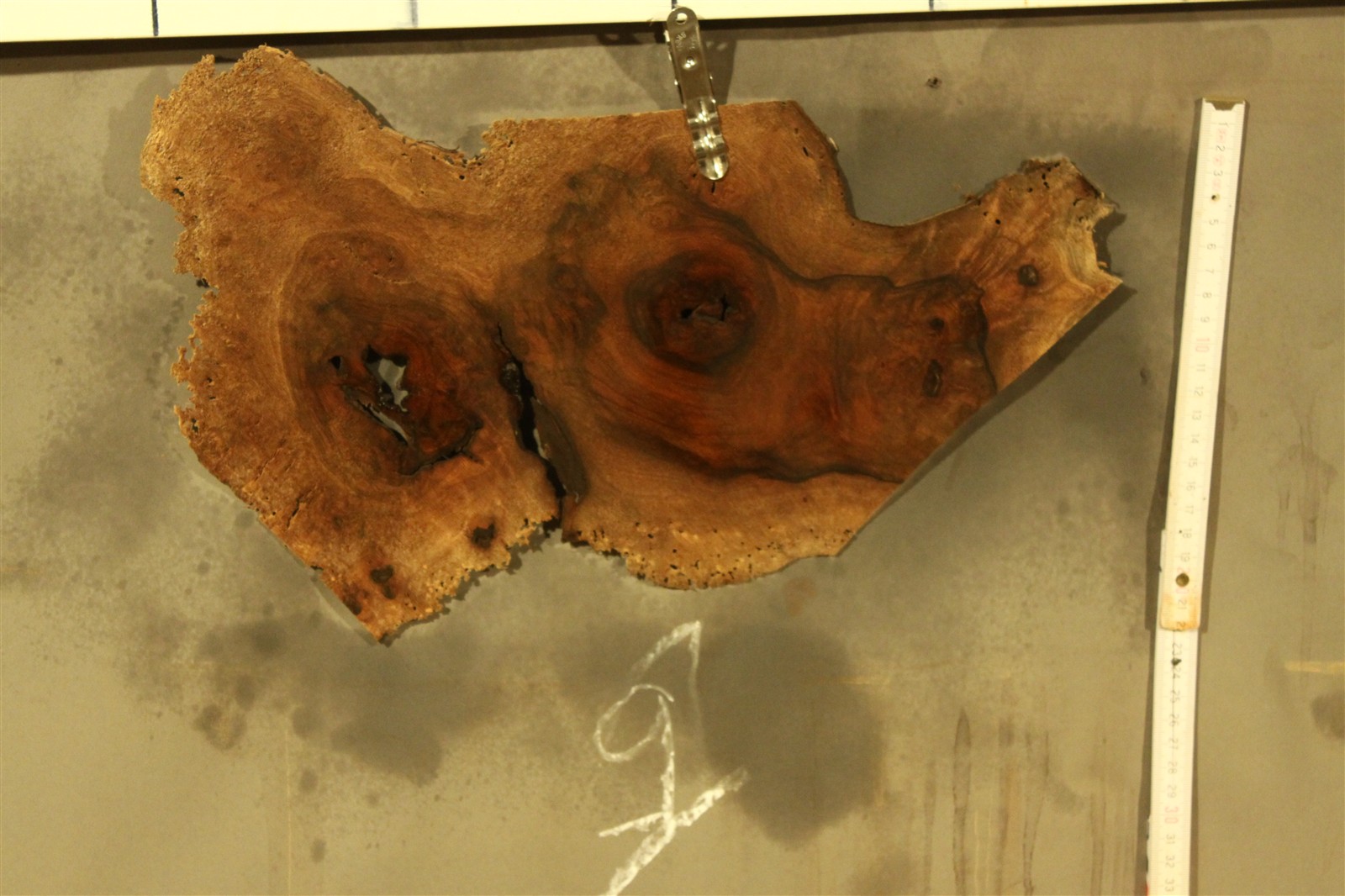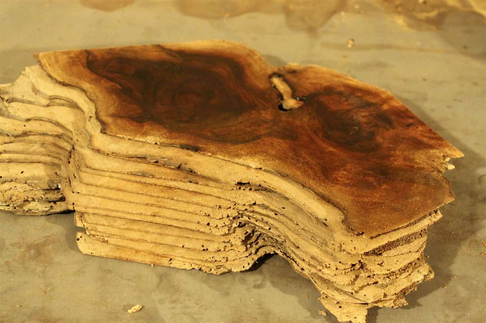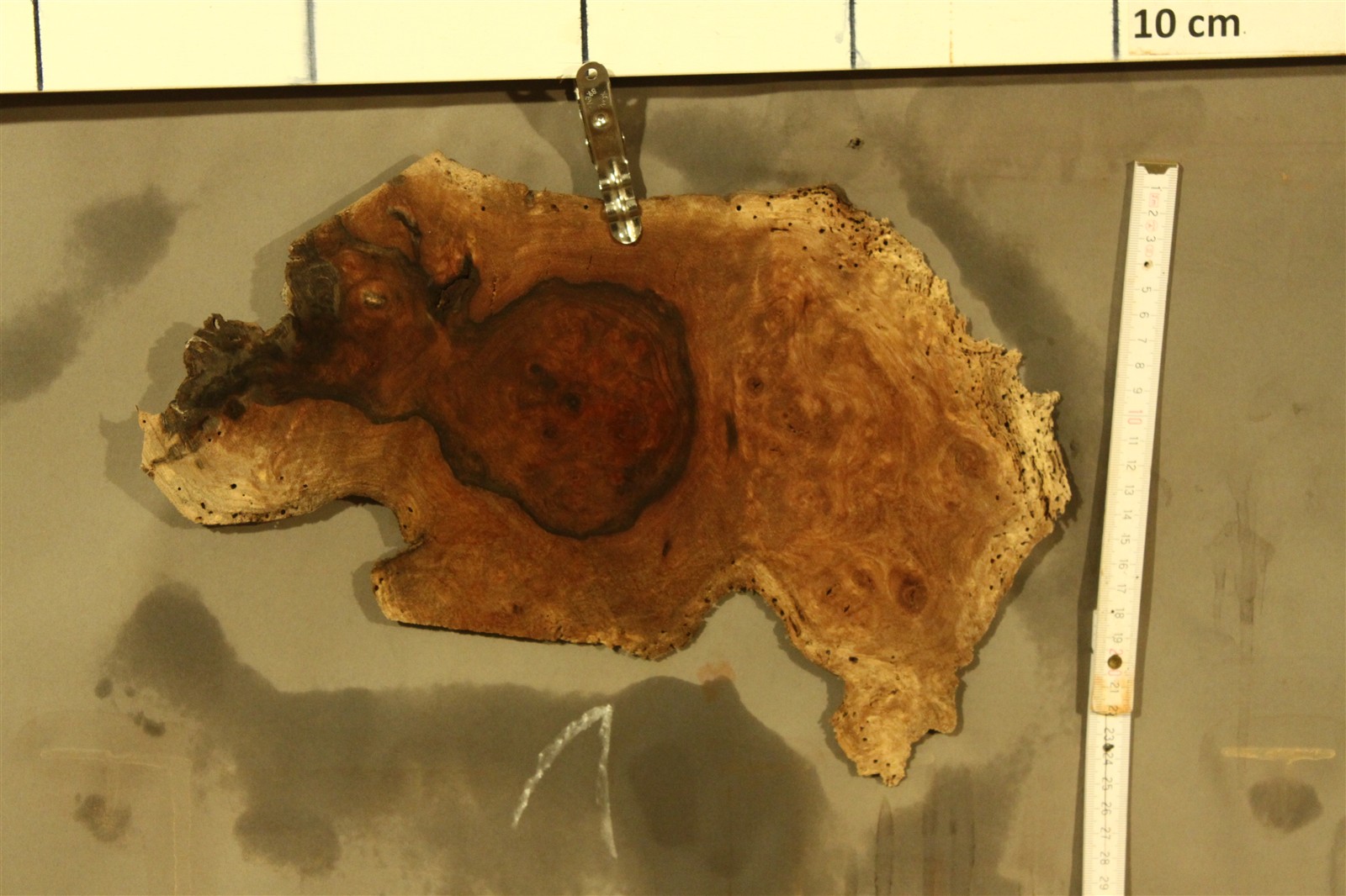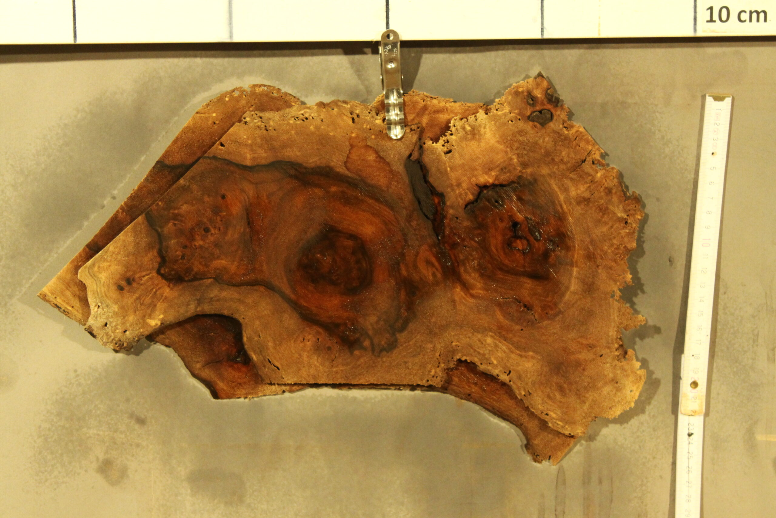Nussbaum-Furnier in 1,8 mm Stärke mit einem Durchmesser von ca. 20 cm und feinem Sägeschnitt.