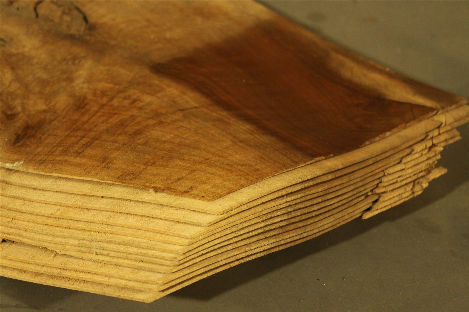 Nussbaum-Furnier in 2 mm Stärke mit einer Länge von 60 cm, einer Breite von 35 cm und Sägeschnitt.
