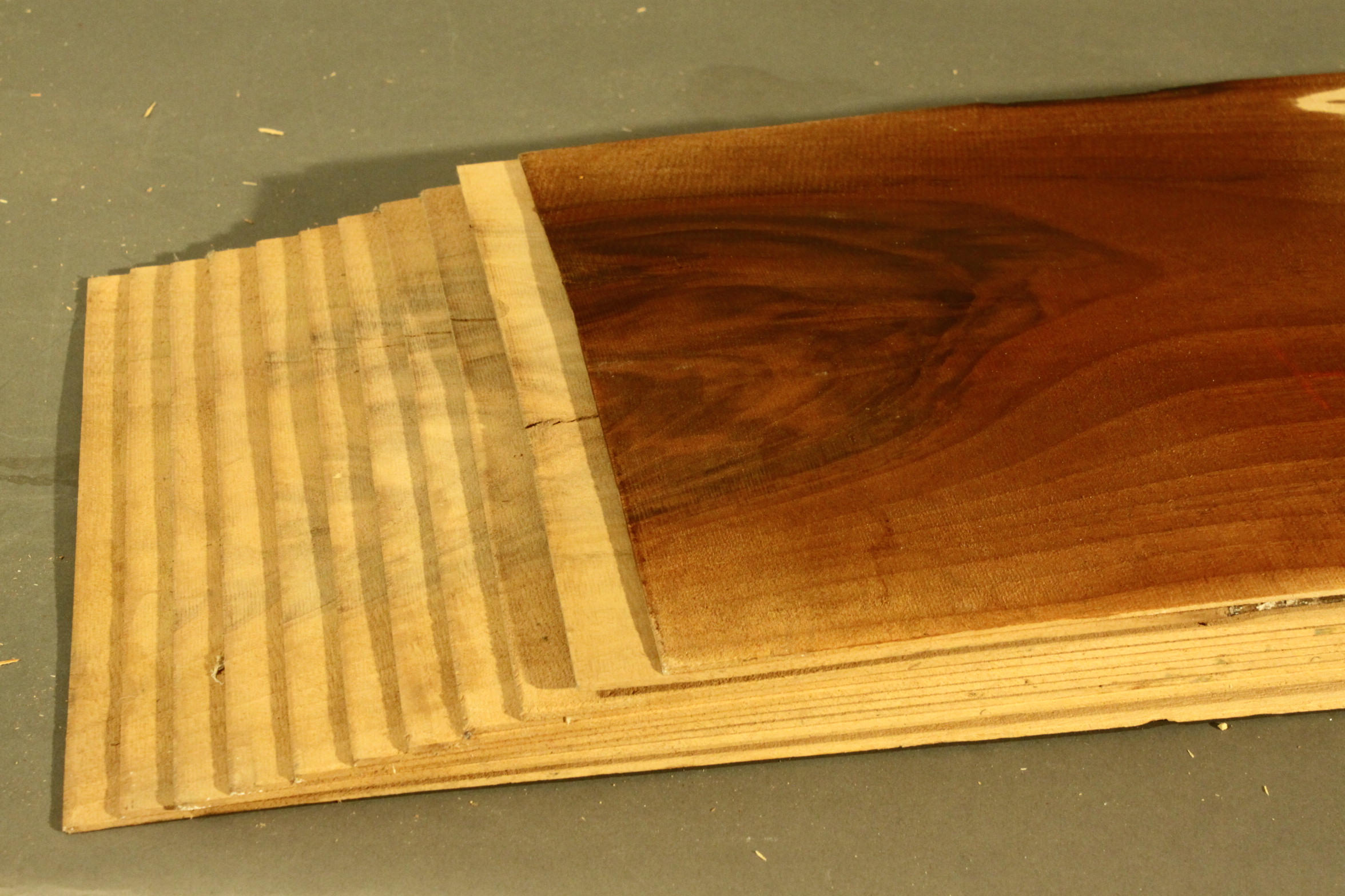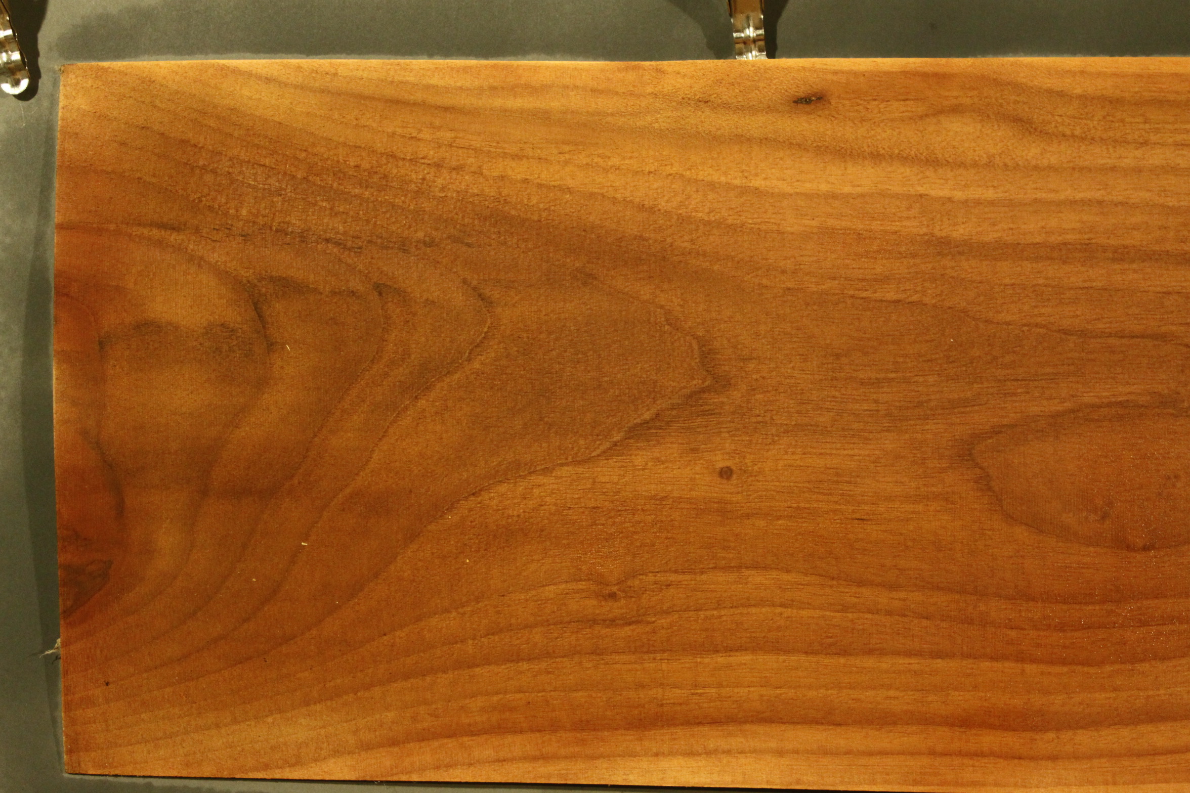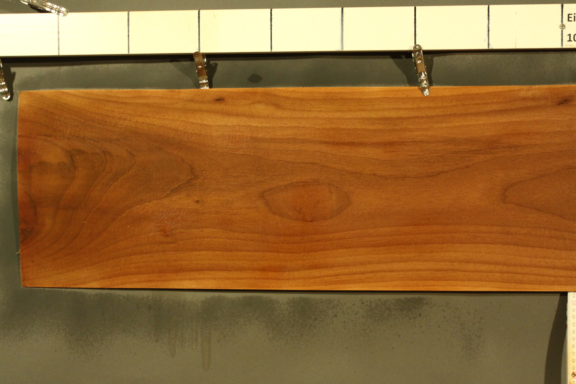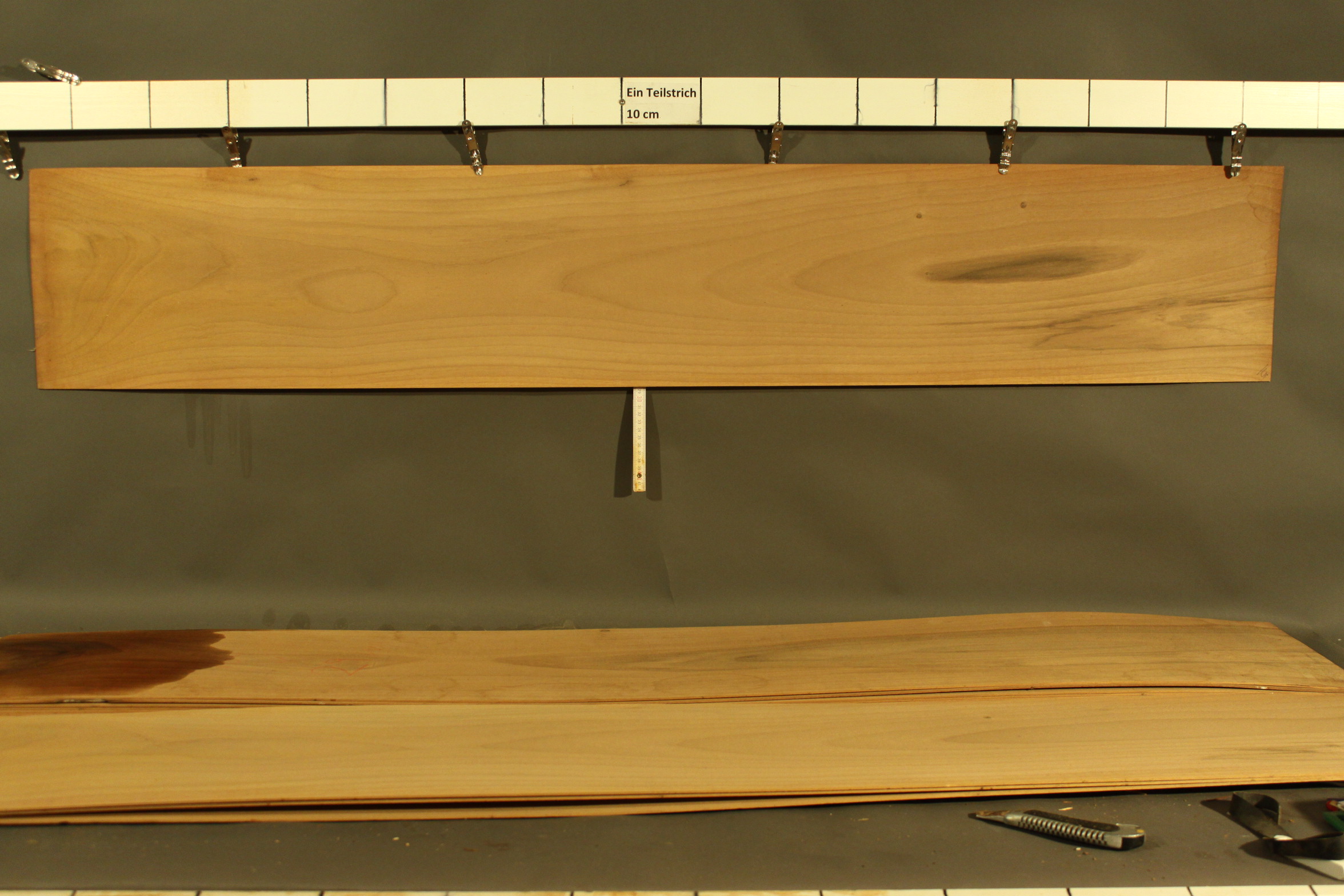 Nussbaum-Furnier in 2,3 mm Stärke mit einer Länge von 163 cm, einer Breite von 18 cm und Sägeschnitt.
