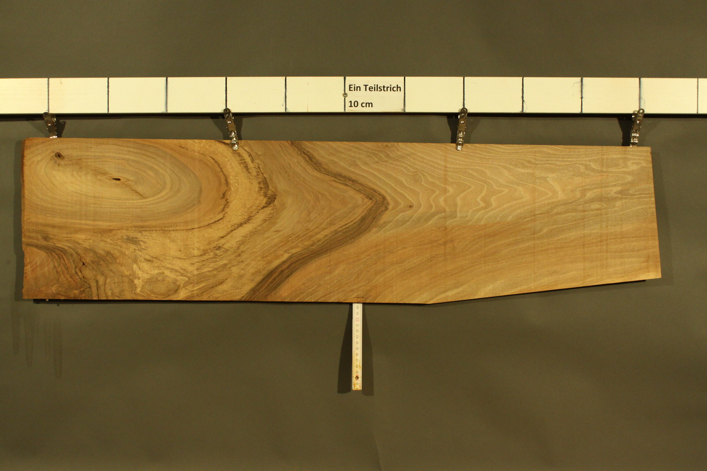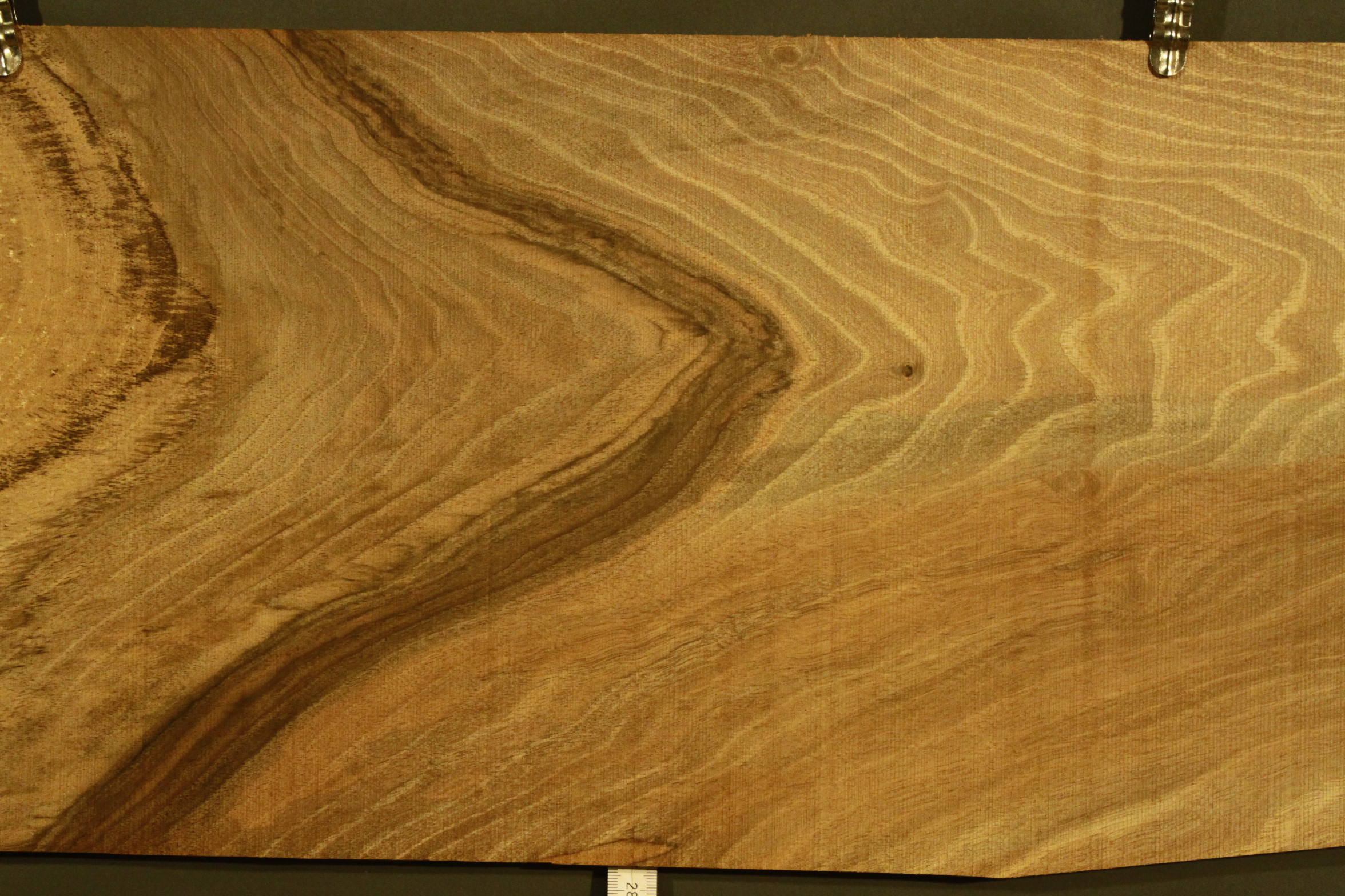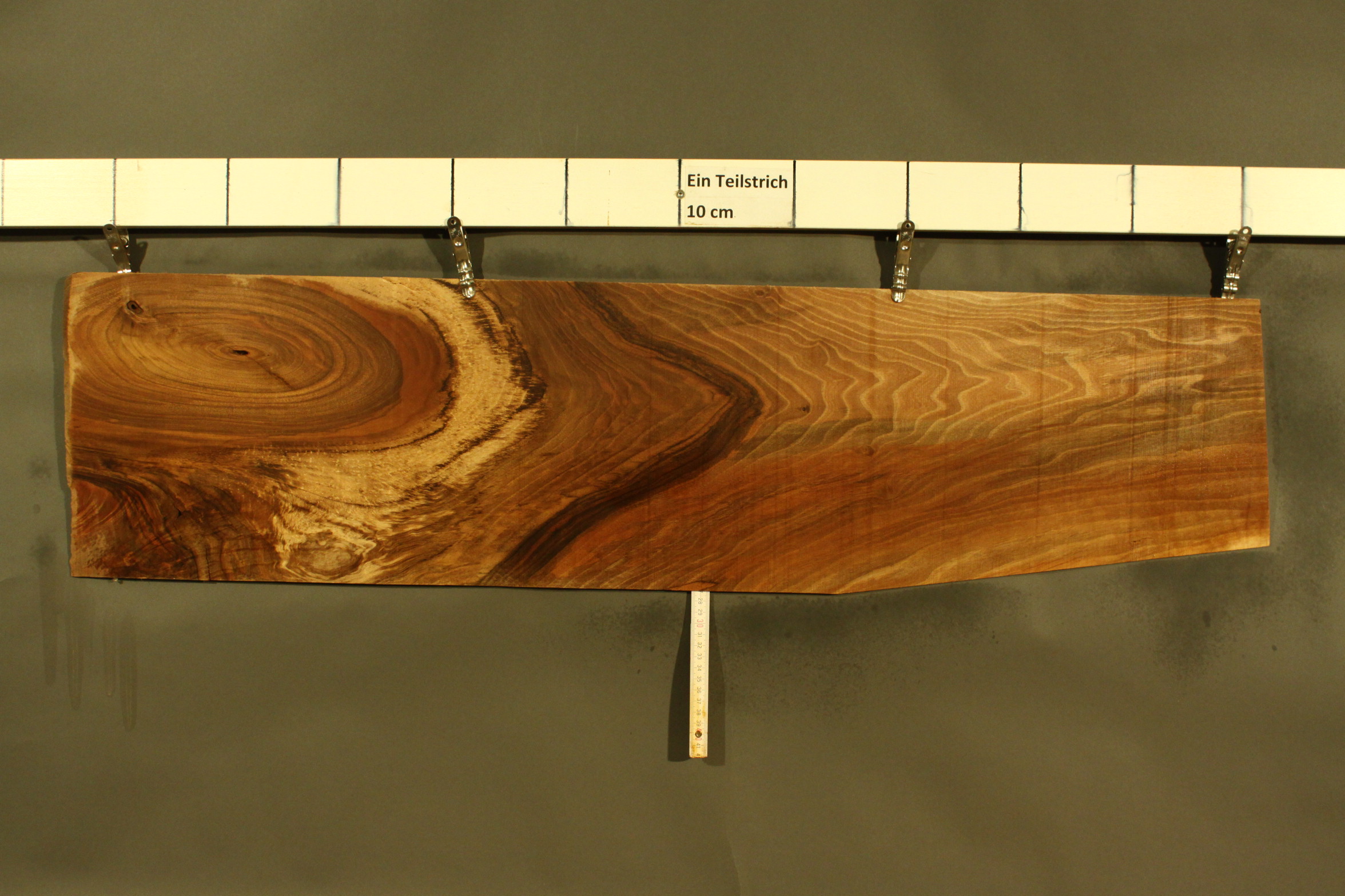 Nussbaum-Furnier in 2,5 mm Stärke mit einer Länge von 108 cm, einer Breite von 24 cm und Sägeschnitt.
