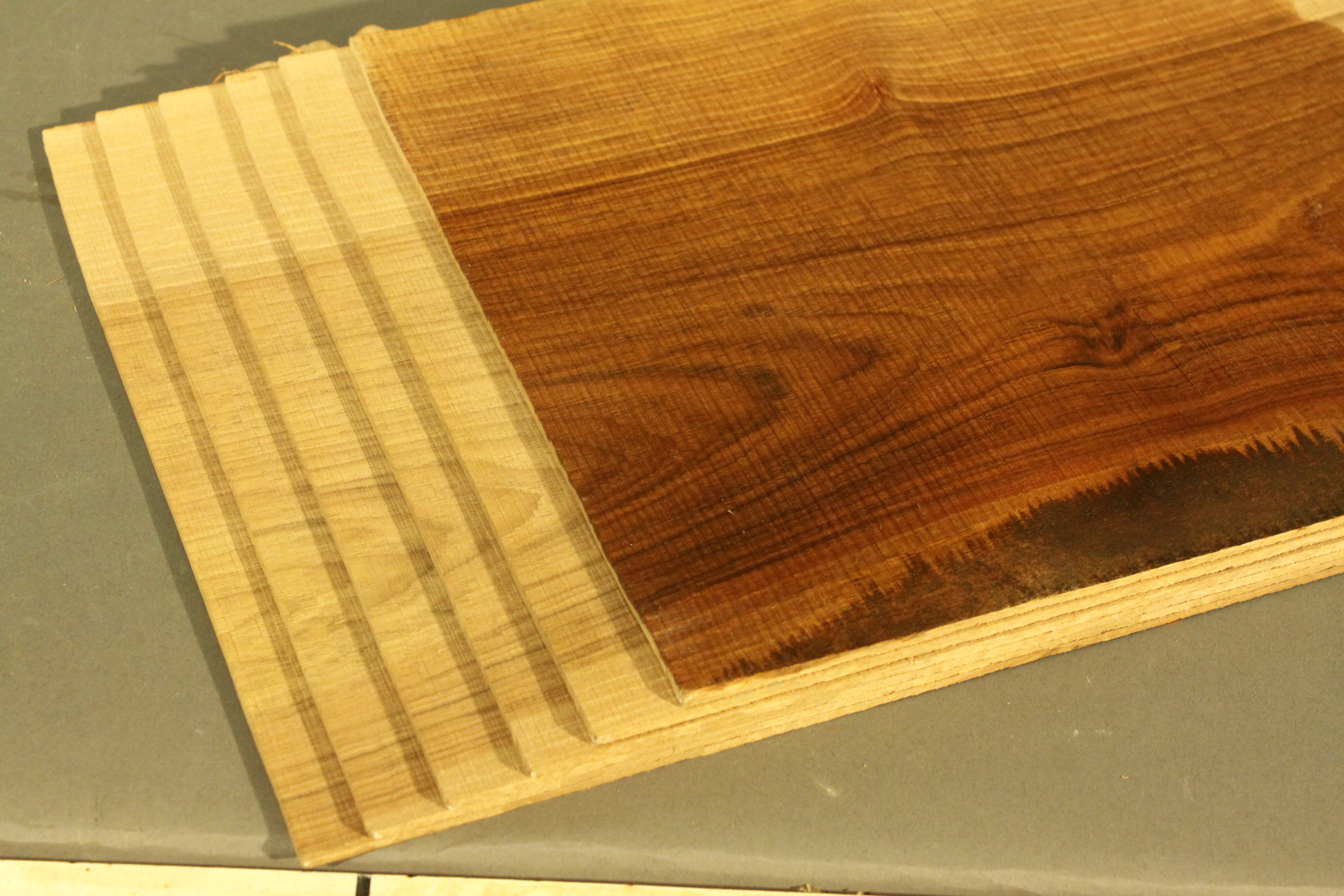 Nussbaum-Furnier in 2,5 mm Stärke mit einer Länge von 123 cm, einer Breite von 24 cm und Sägeschnitt.