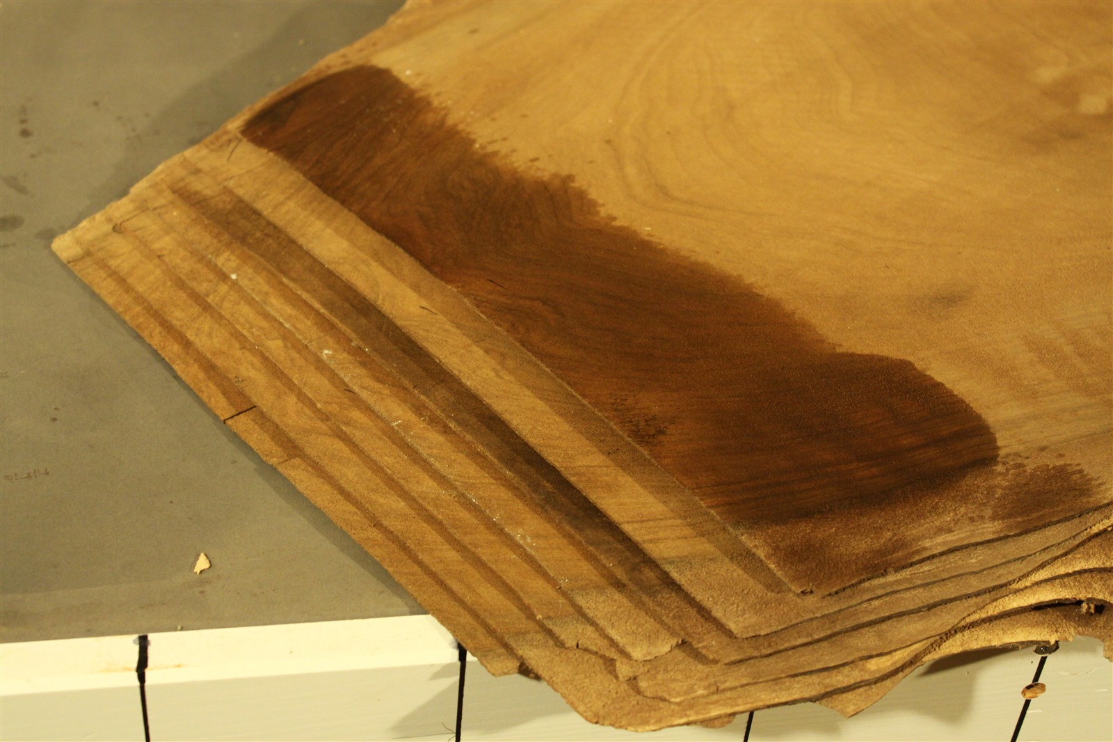 Nussbaum-Furnier in 2,5 mm Stärke mit einer Länge von 75 cm, einer Breite von 43 cm und Sägeschnitt.