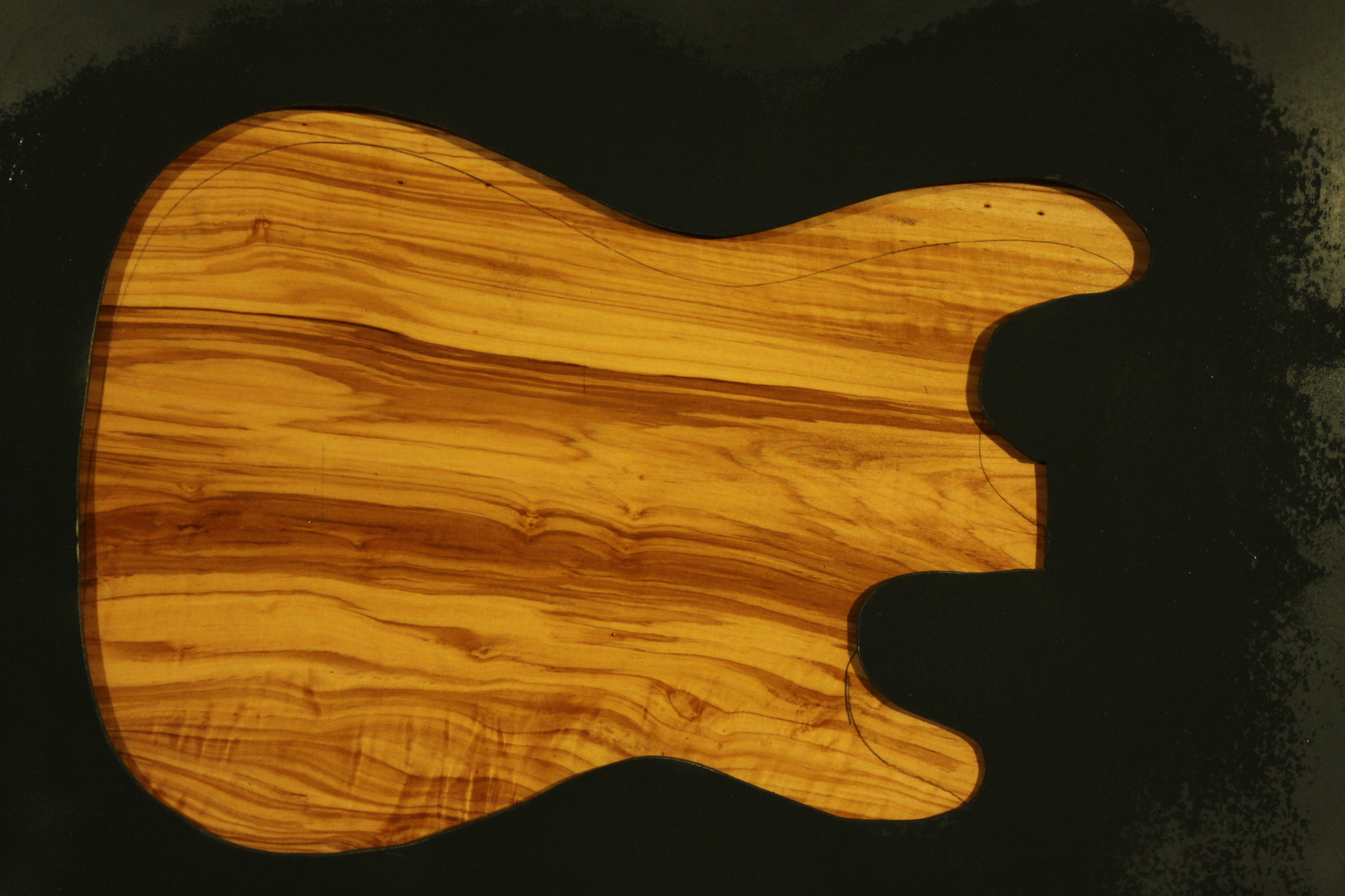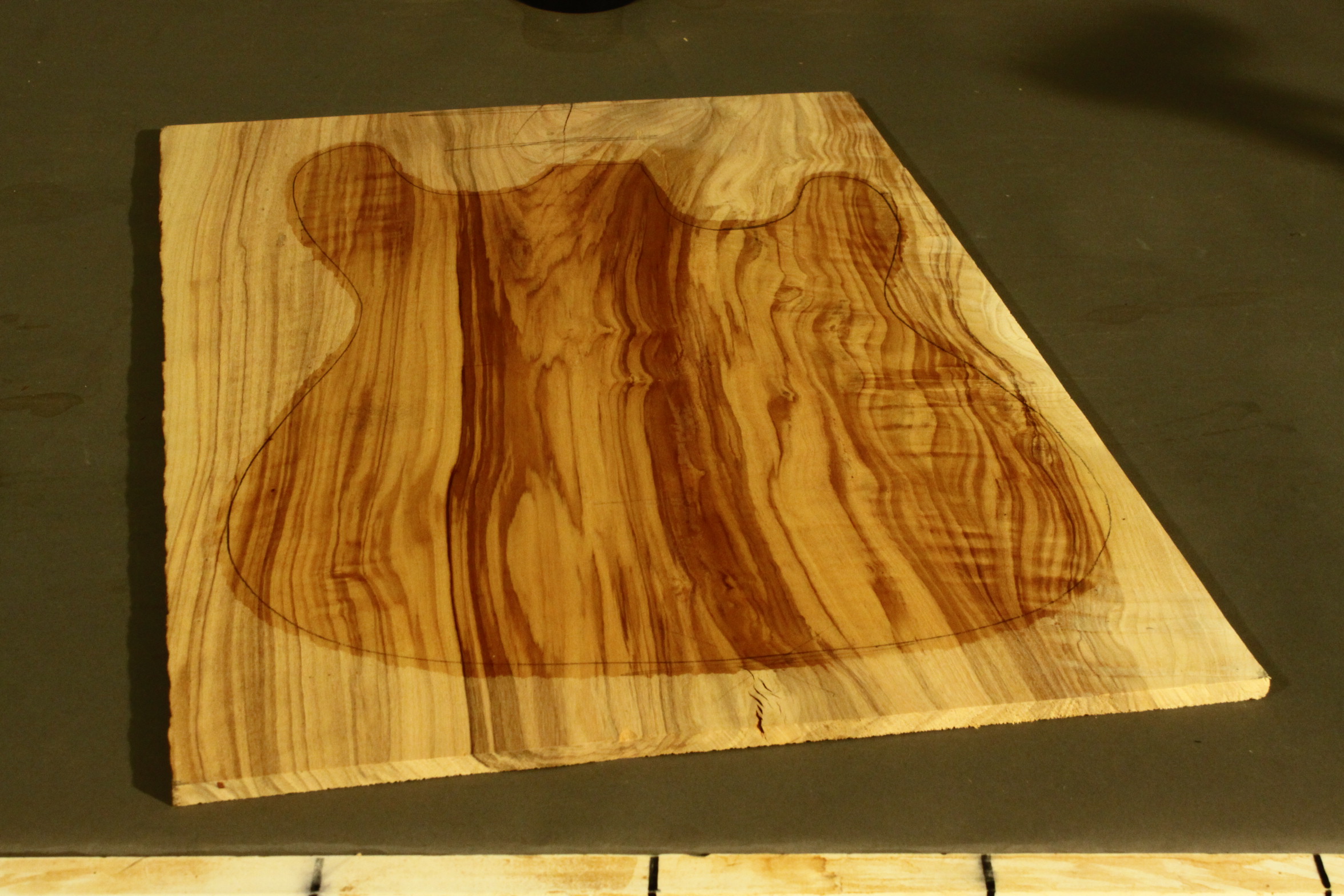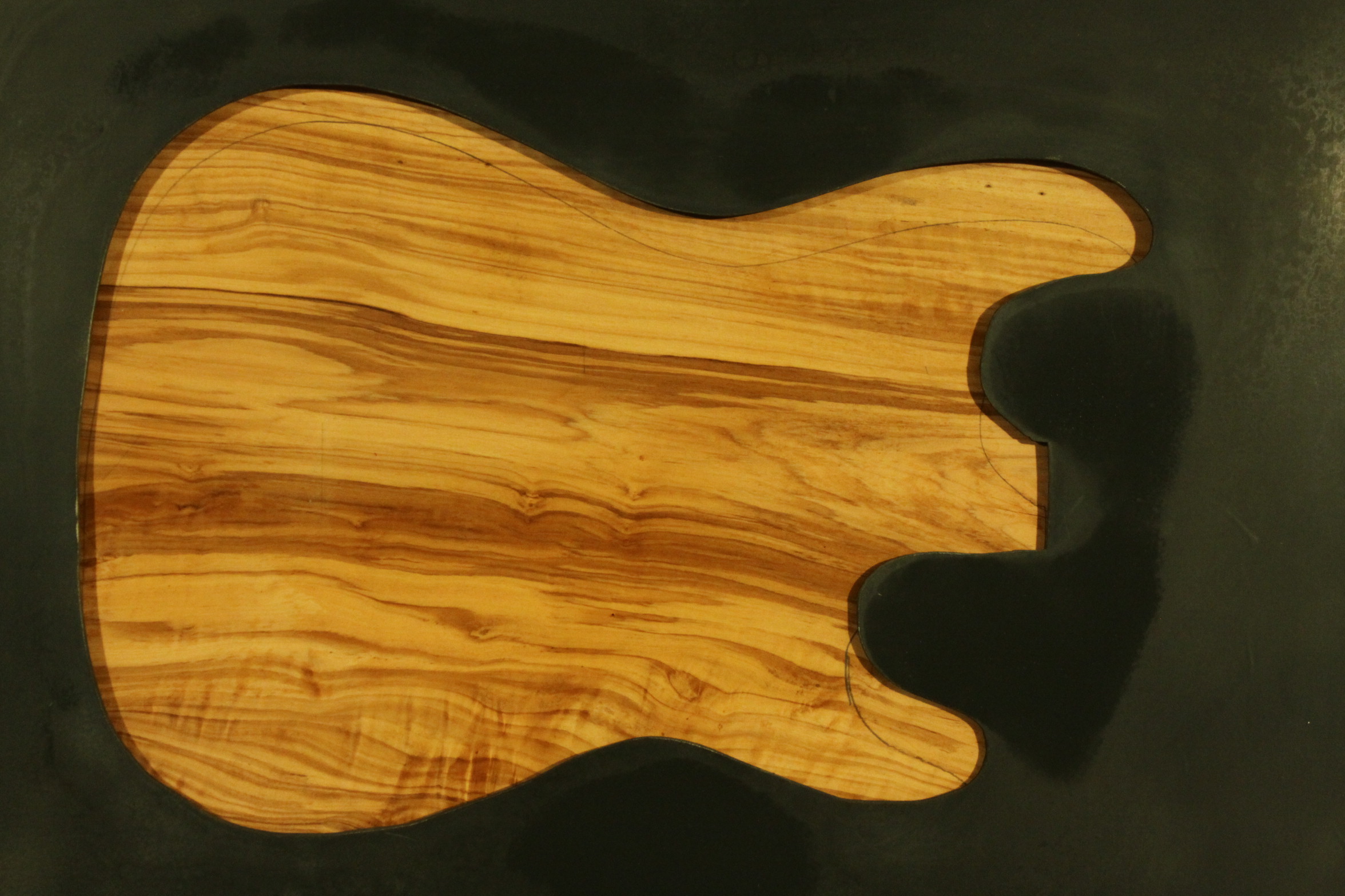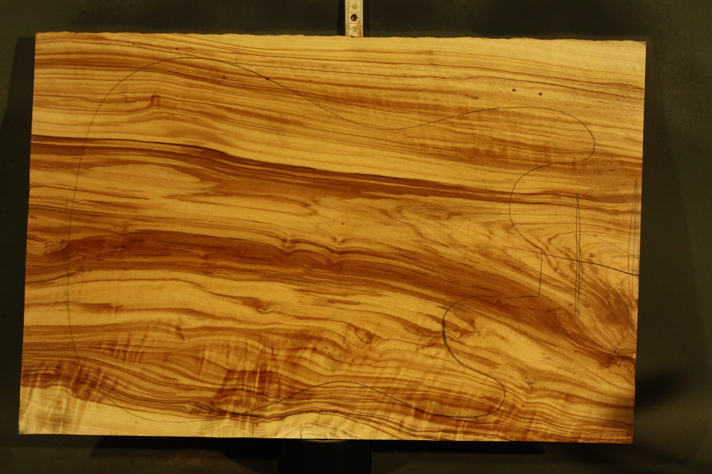 Olivenholz-Aufleimer in 9 mm Stärke mit einer Länge von 54 cm und einer Breite von 36 cm mit gehobelter Oberfläche als Tonholz zum Instrumentenbau.