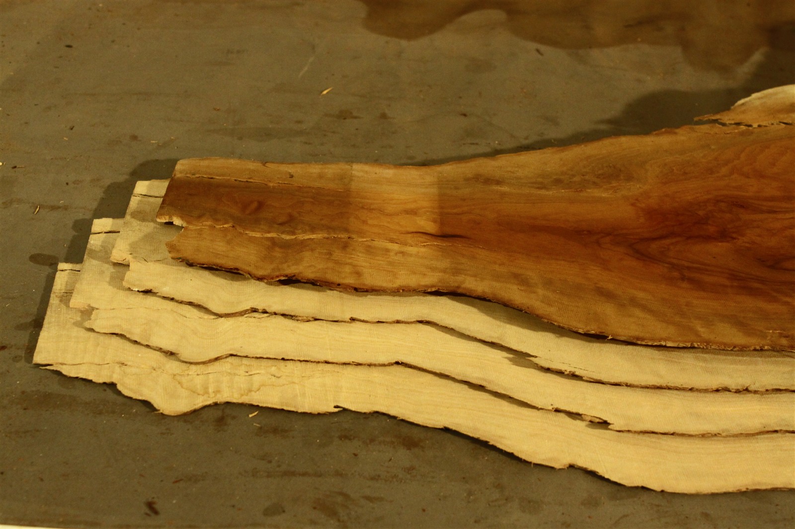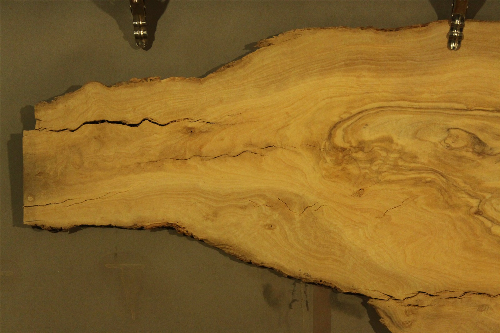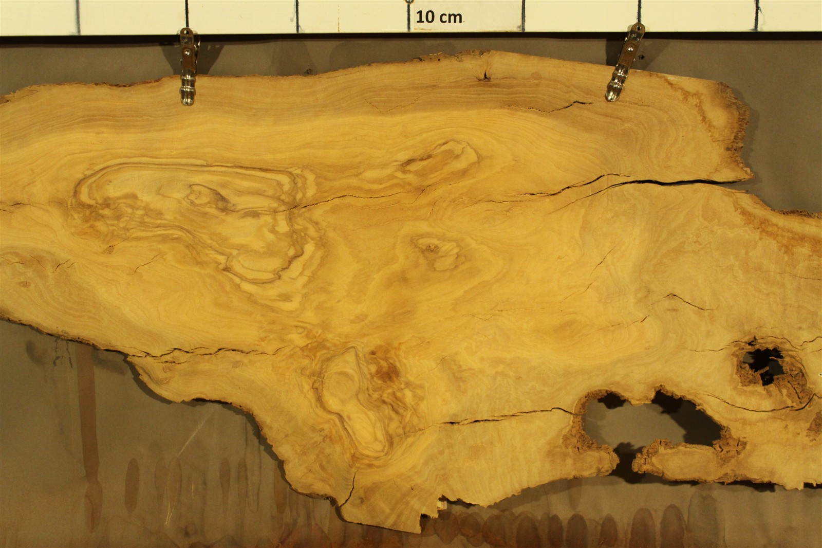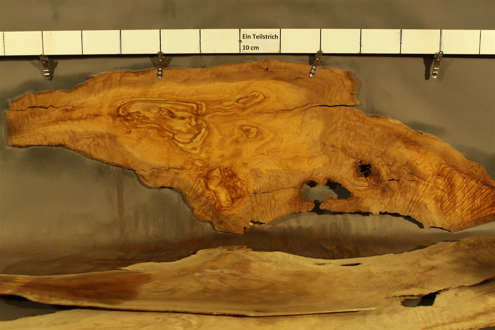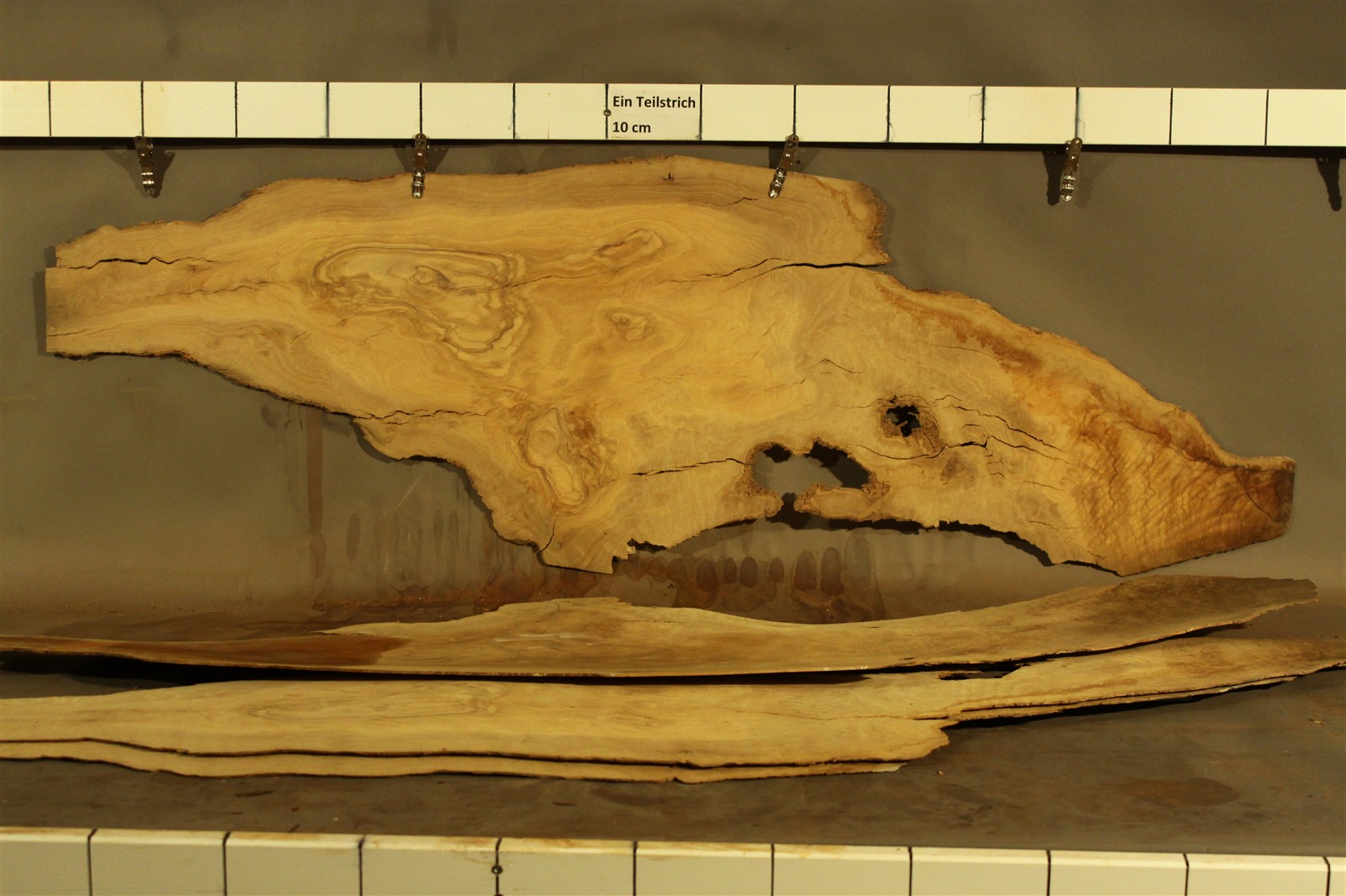 Olivenholz-Furnier in 3 mm Stärke mit einer Länge von 125 cm, einer Breite von 30 cm und Sägeschnitt.