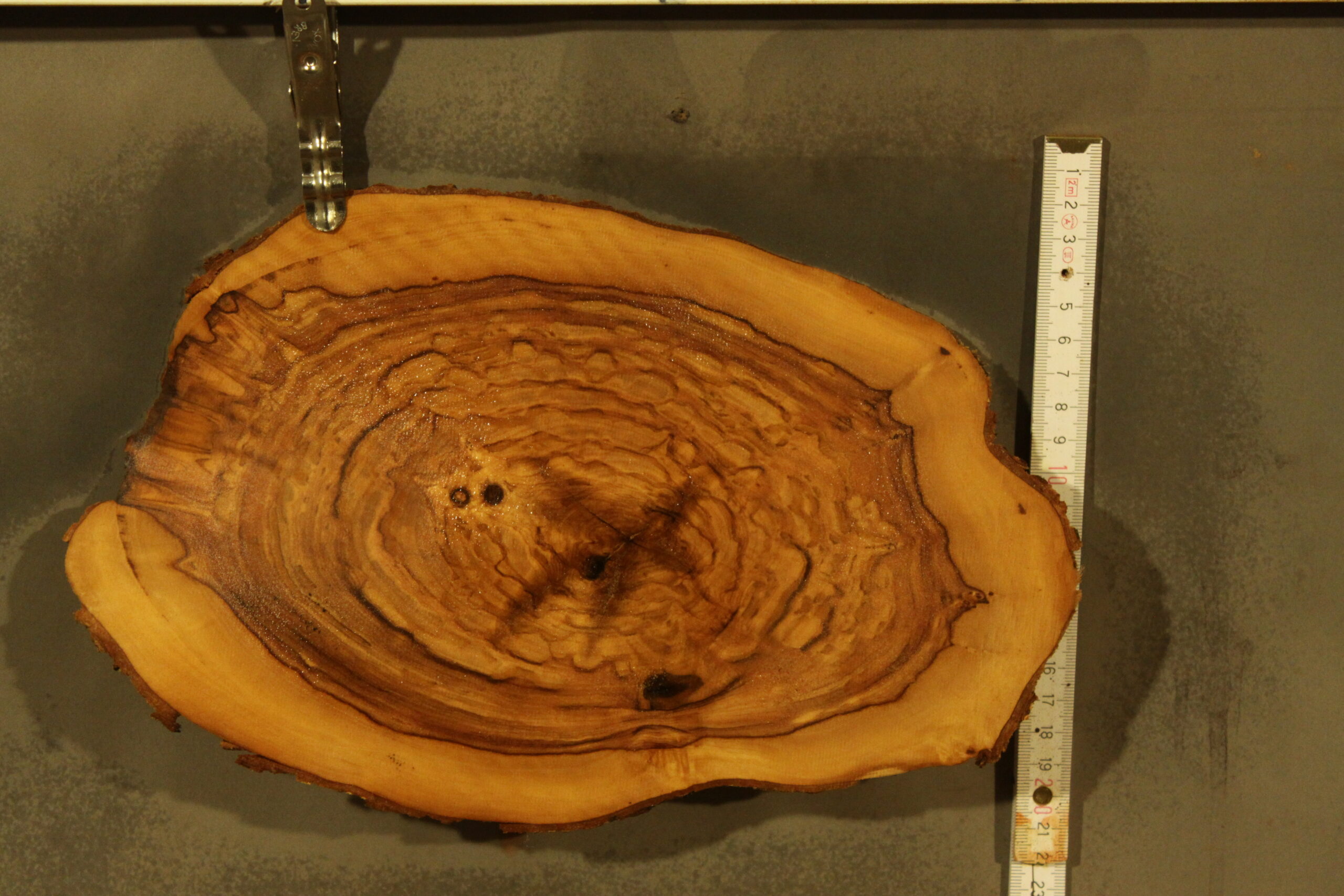 Olivenholz-Furnier in 1,8 mm Stärke mit einem Durchmesser von 17 cm und feinem Sägeschnitt. Es handelt sich um Kopfholz, der Stamm wurde auf 45° Grad gesägt.