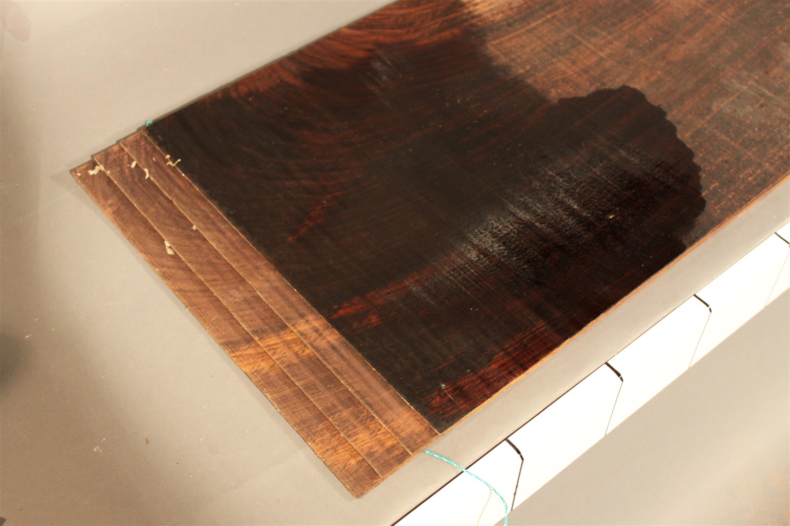 Ostindischer Palisander – Furnier in 2,5 bis 4 mm Stärke mit einer Länge von 115 cm und einer Breite von 37 cm. Das Furnier weist einen groben Sägeschnitt auf. Der angegebene Preis bezieht sich auf ein einzelnes Blatt des abgebildeten Paketes.