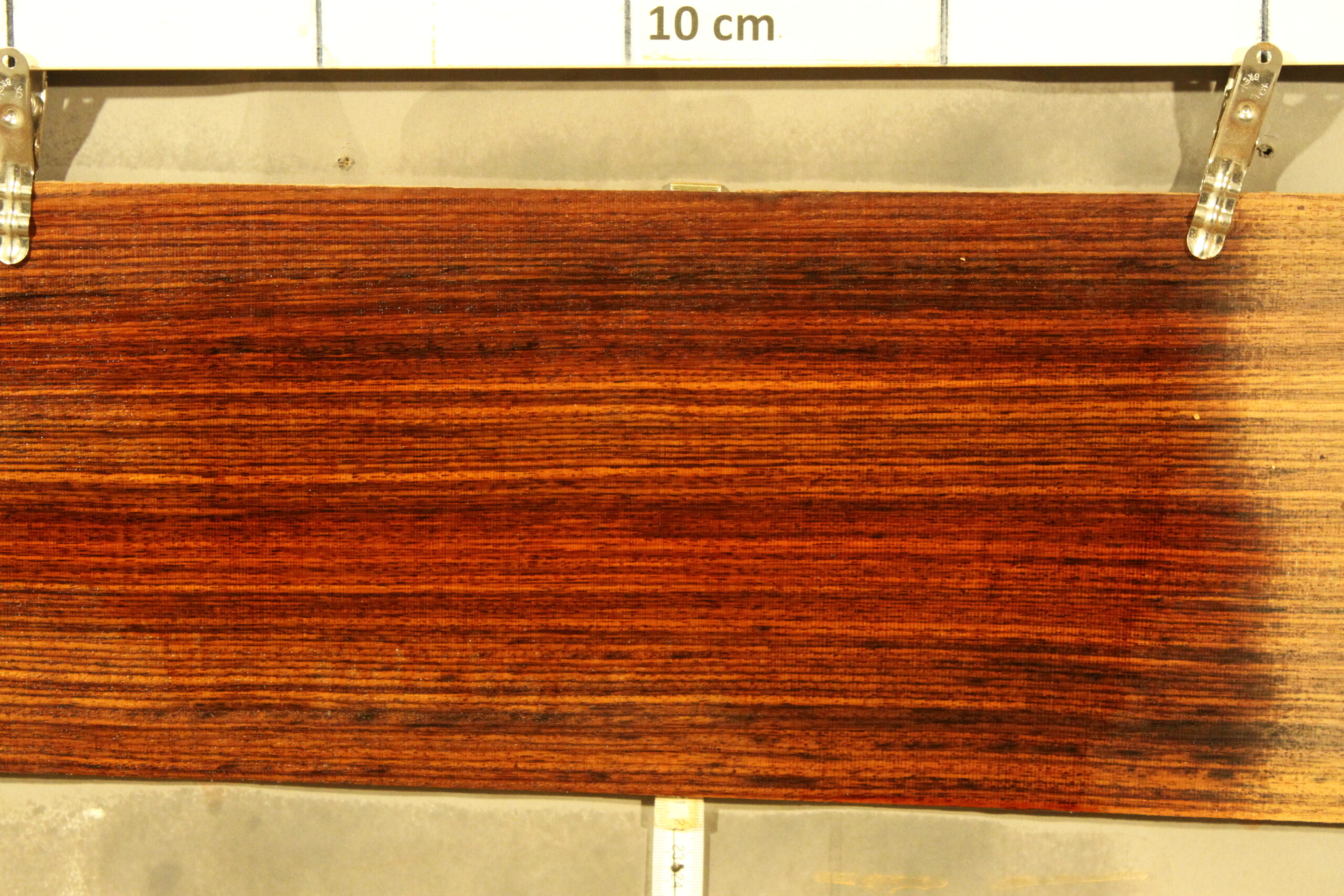 Ostindischer Palisander – Furnier in 2,5 / 3,5 mm Stärke (je nach gewähltem Blatt) mit einer Länge von 120 cm, einer Breite von 20 cm und feinem Sägeschnitt.