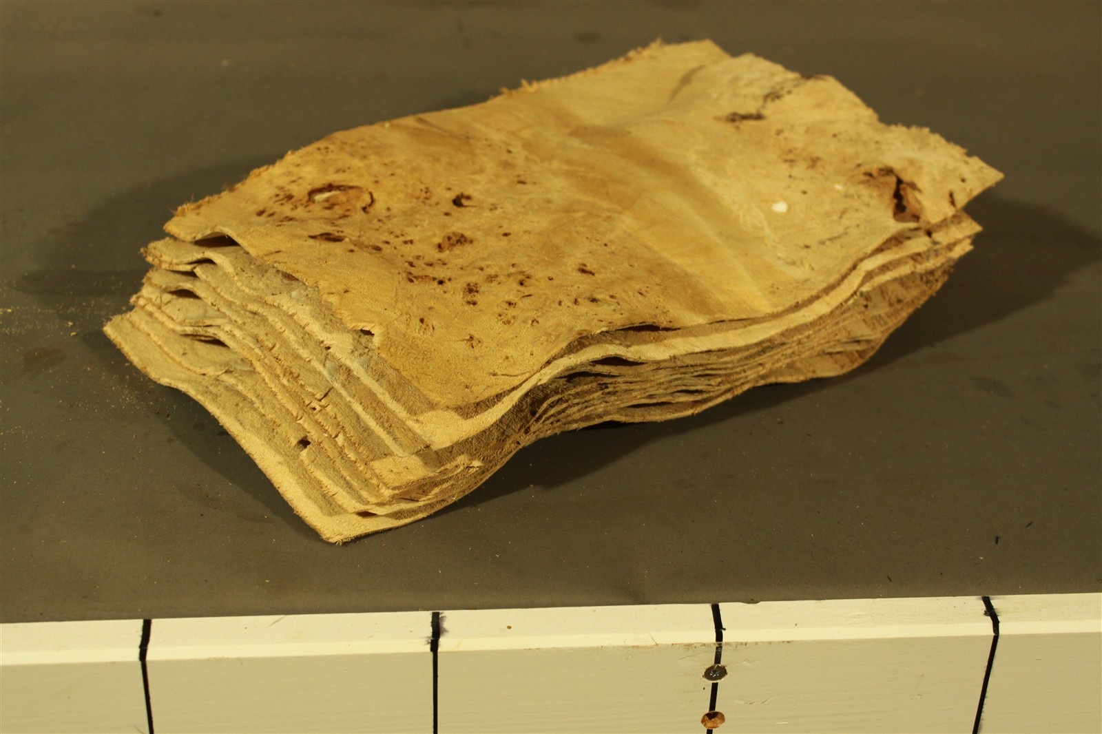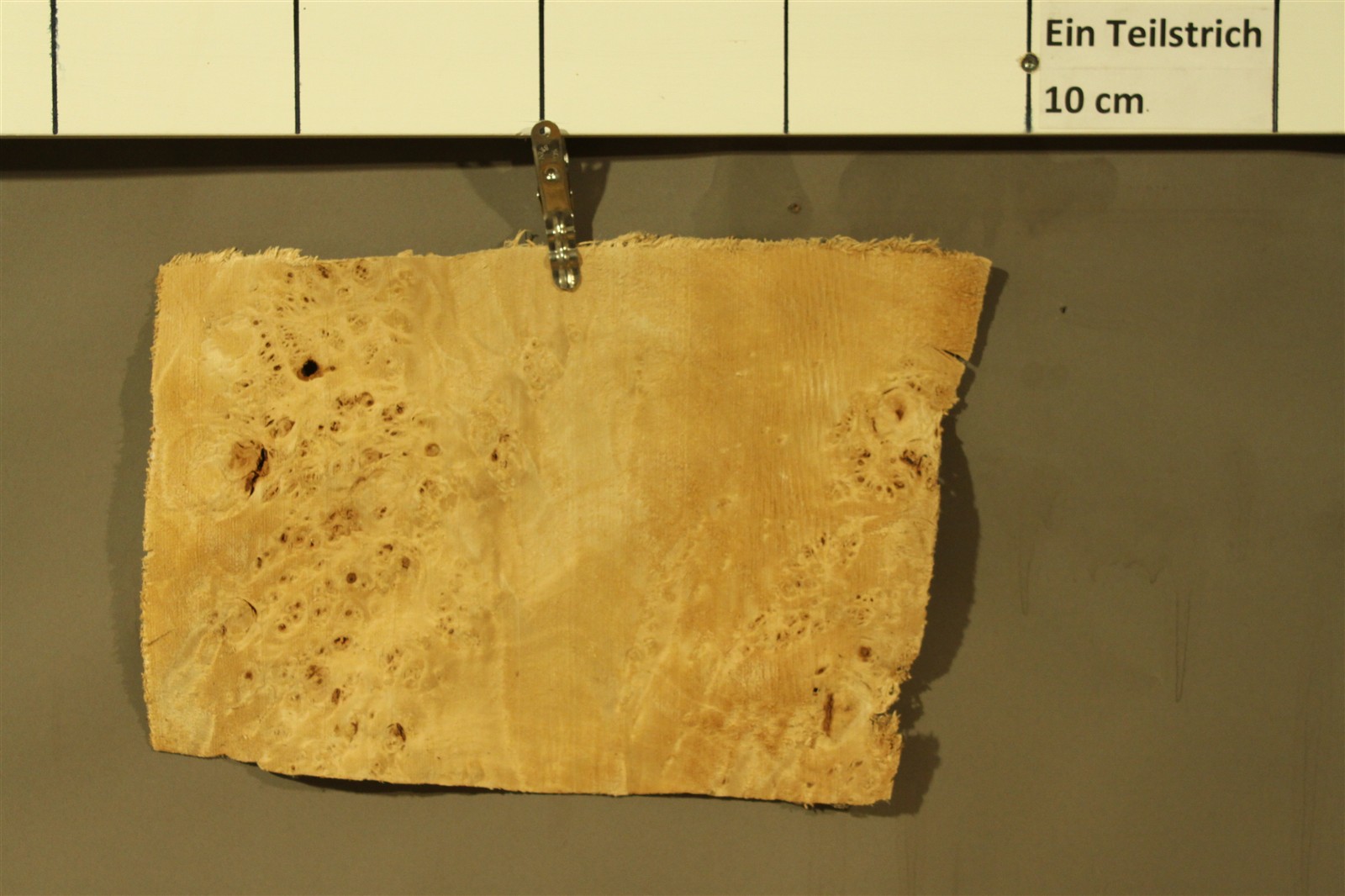 Pappel-Maser-Furnier in 2,5 mm Stärke mit einer Länge von 30 cm und einer Breite von 23 cm. Der Sägeschnitt ist grob.