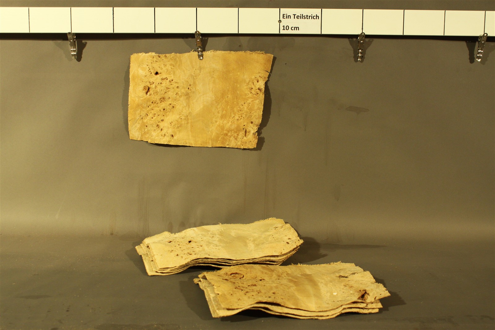 Holz ist ein Naturprodukt. Die Blätter aus einem Furnier-Paket weisen daher einen natürlichen Verlauf in Farbe und Muster auf; kein Blatt gleicht dem anderen. Die Abbildungen sind daher als Auszüge des Furnier-Pakets zu verstehen und bilden i.d.R. nur einzelne Blätter des Gesamtpakets ab.
