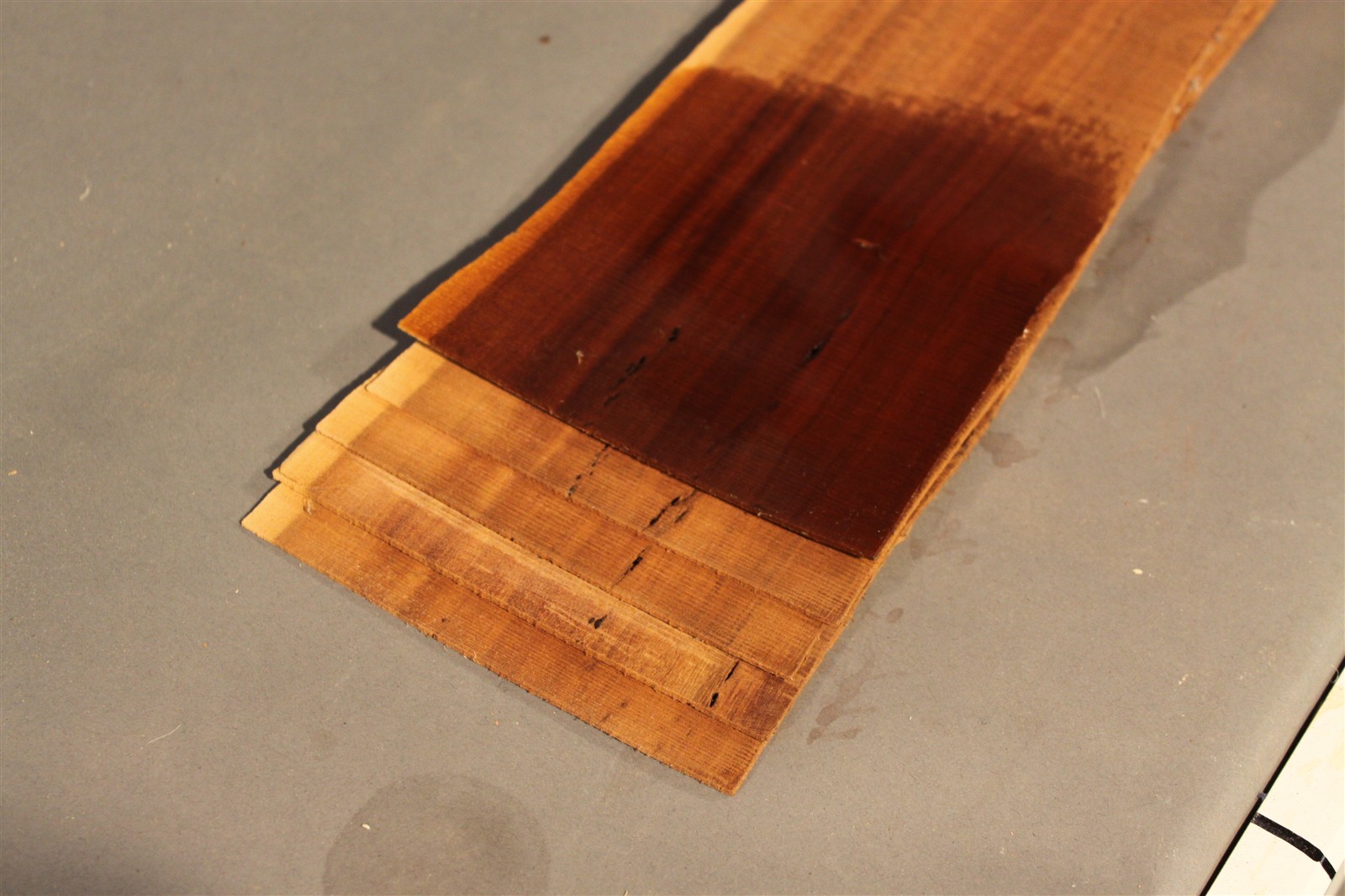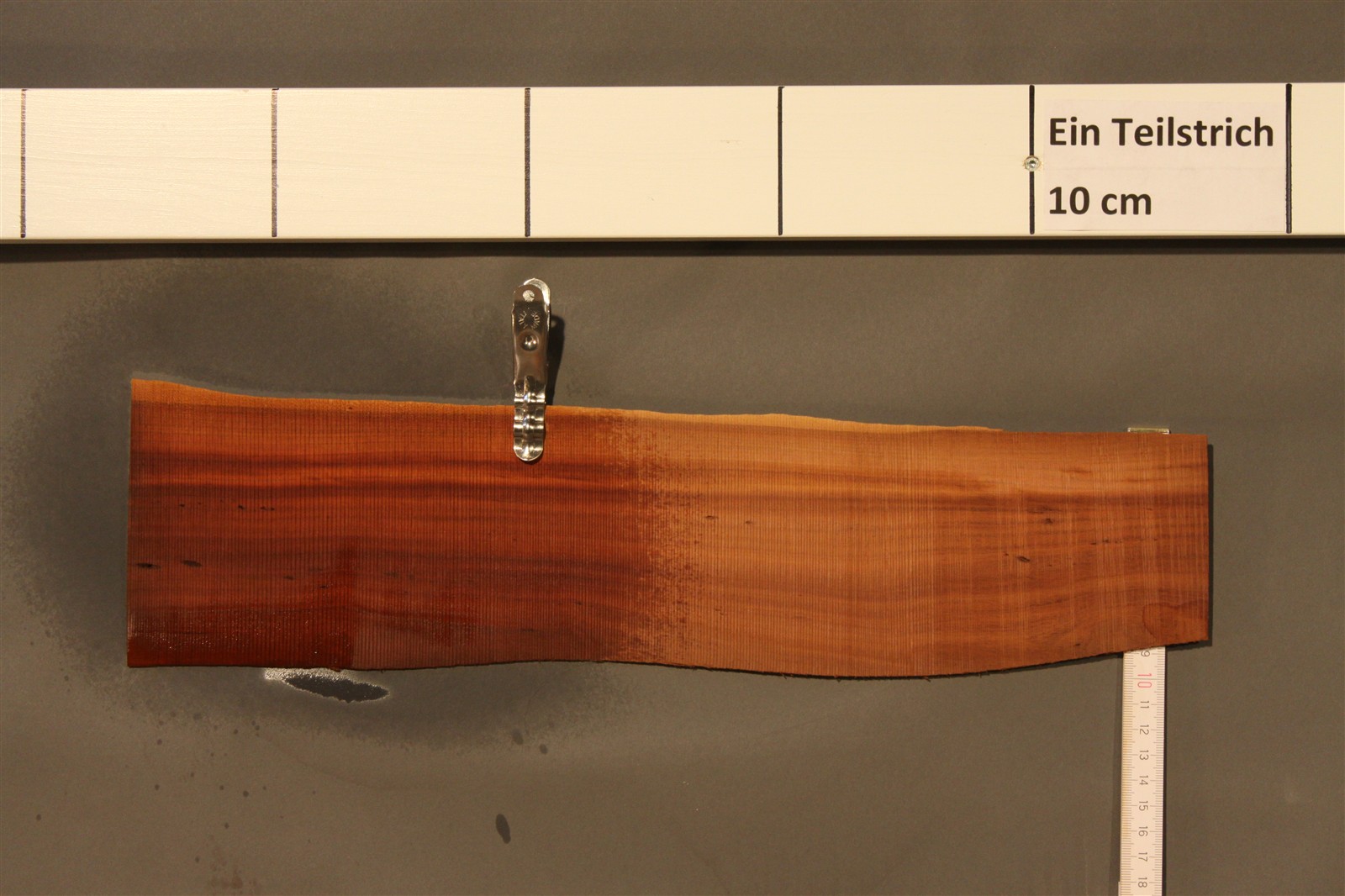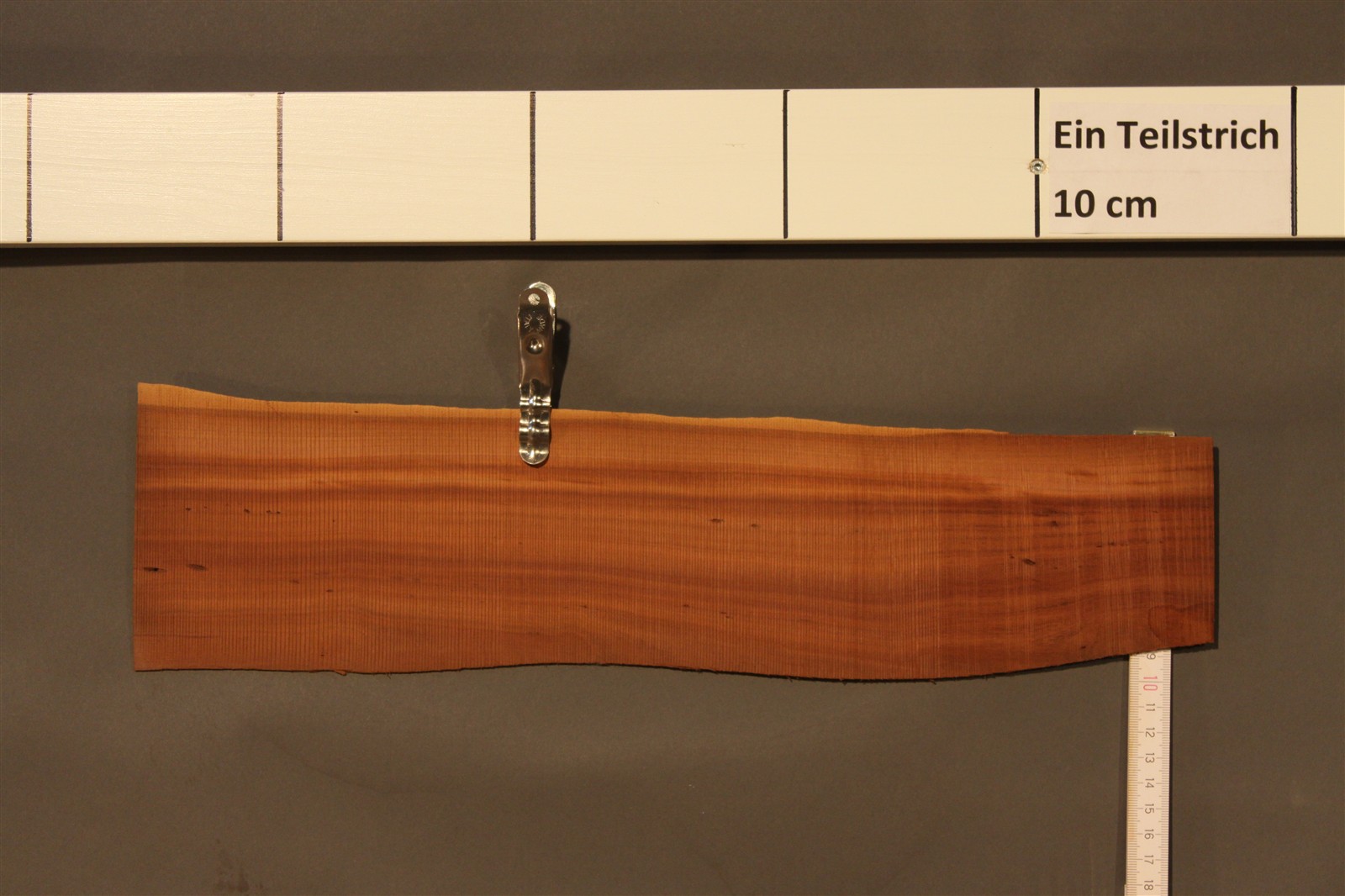 Pflaumenbaum-Furnier in 1,5 mm Stärke mit einer Länge von 40 cm und einer Breite von 9 cm. Das Furnier weist einen rauen Sägeschnitt auf.