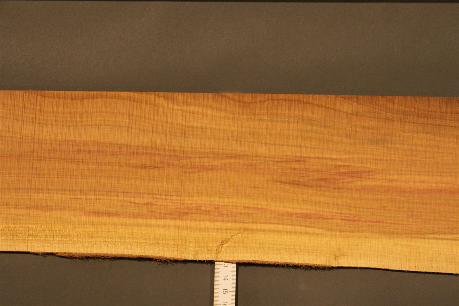 Pflaumenbaum-Furnier in 3 mm Stärke mit einer Länge von 85 cm und einer Breite von 12 cm. Das Furnier weist einen rauen Sägeschnitt auf.