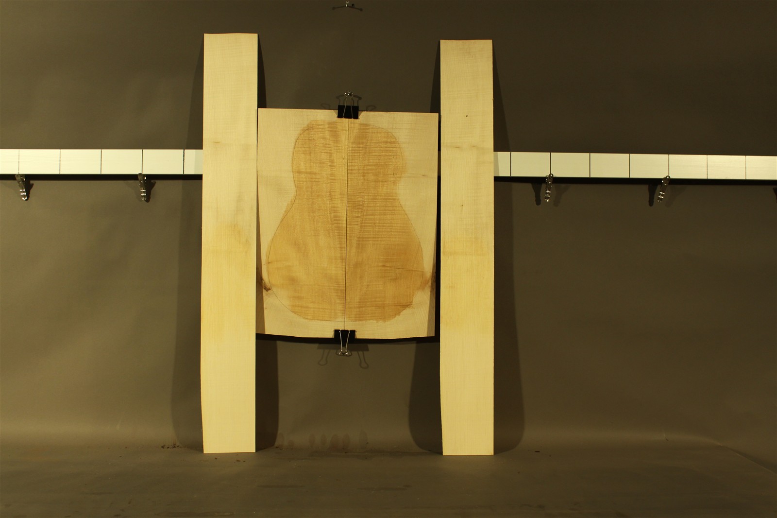 Riegelahorn-Furnier, jeweils zwei Blatt in 4mm-Stärke mit den Maßen 54 x 22 cm und zwei Blatt in 3,5mm-Stärke mit den Maßen 100 x 13 cm – als passendes Set für Gitarrenbau / Instrumentenbau (Akustik). Das Tonholz ist einseitig geschliffen (K36). Der angegebene Preis bezieht sich auf alle vier Blätter bzw. das abgebildete Set.