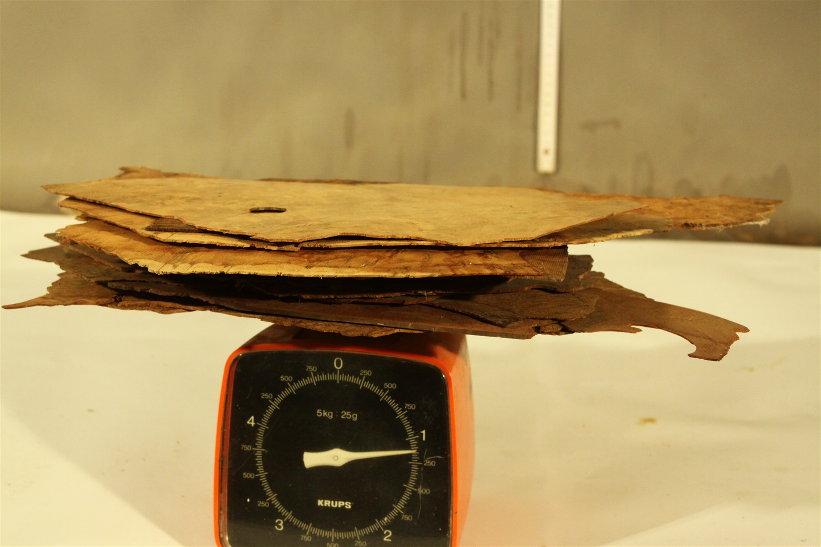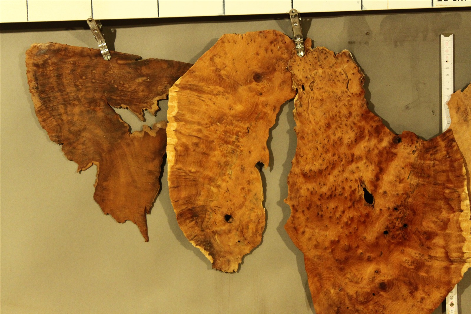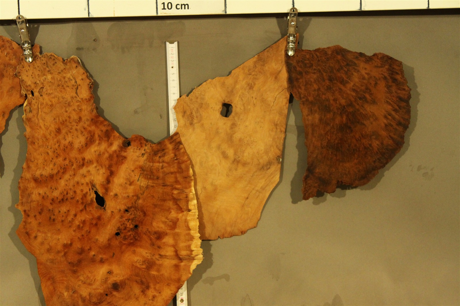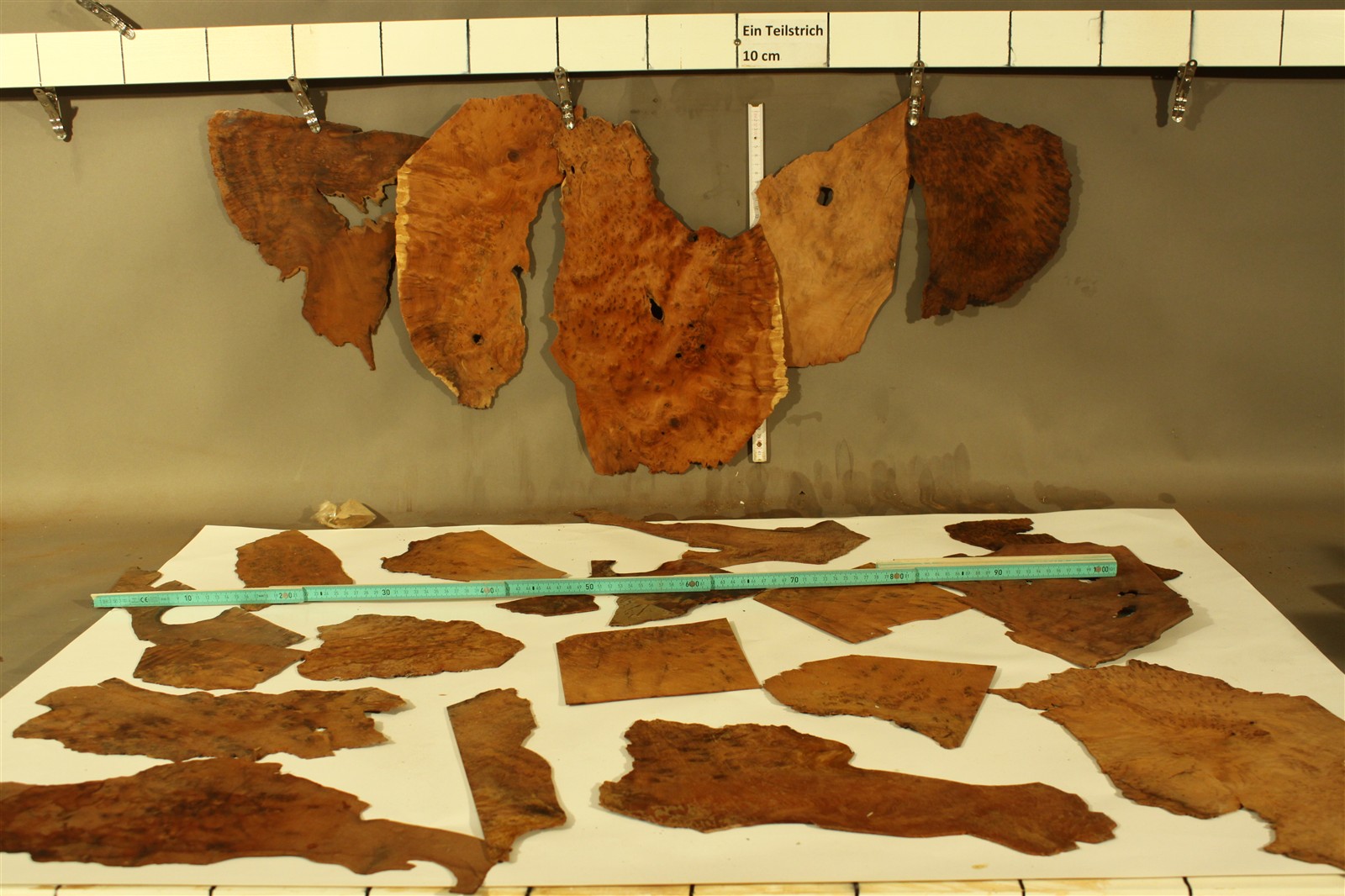 Sortiment an Furnier-Einzelblättern Thuja in Stärken zwischen 1,2 und 2,5 mm und mit feinem Sägeschnitt. Der angegebene Preis bezieht sich auf das gesamte abgebildete Paket mit einem Gewicht von über 1kg.